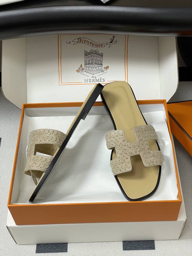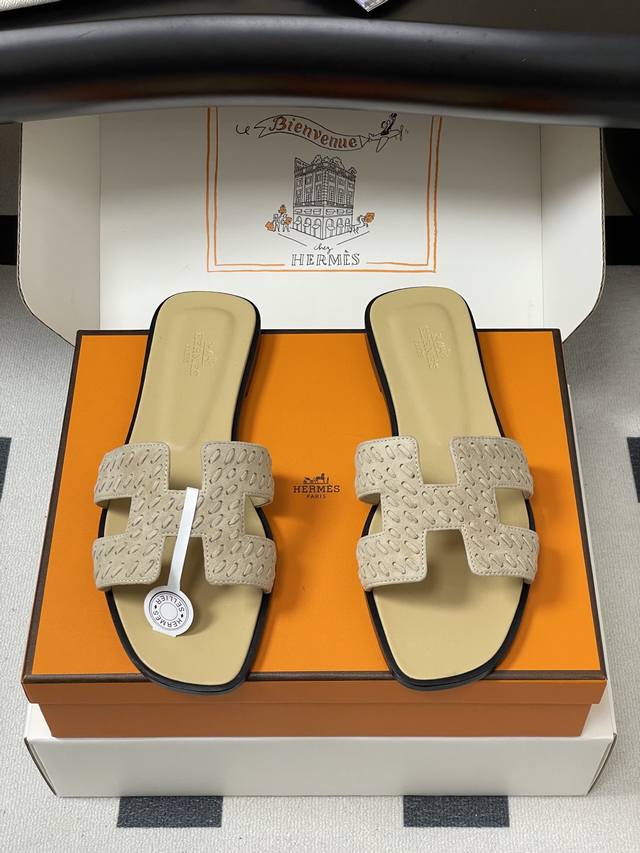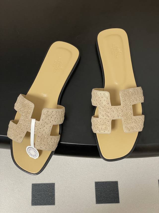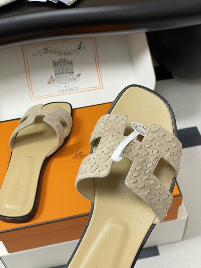 / 顶级品质 配高档飞机盒 Hermes 爱马仕 Oran凉鞋编织麂皮系列 2025H家最新版面 经典H编织绒面H鞋面凉拖鞋 编织麂皮山羊皮凉鞋,经典“H”型鞋面