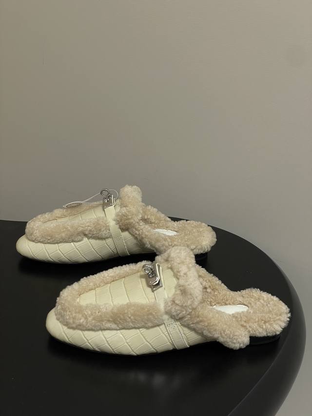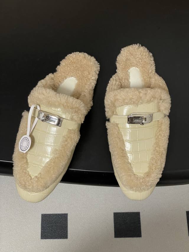 顶级品质 Hermes 爱马仕 H家 25最新鳄鱼纹皮Oz羊毛穆勒鞋经典Kelly扣包头半拖鞋 H经典半拖毛拖鞋 小牛皮穆勒鞋,搭配经典镀钯Kelly鞋扣和羊羔