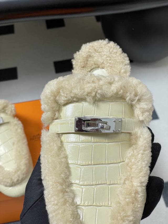 / 顶级品质 Hermes 爱马仕 H家 25最新鳄鱼纹皮Oz羊毛穆勒鞋经典Kelly扣包头半拖鞋 H经典半拖毛拖鞋 小牛皮穆勒鞋,搭配经典镀钯Kelly鞋扣和羊羔