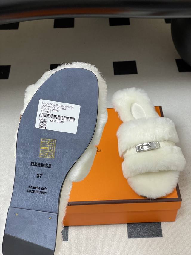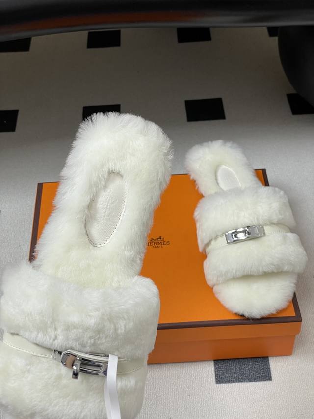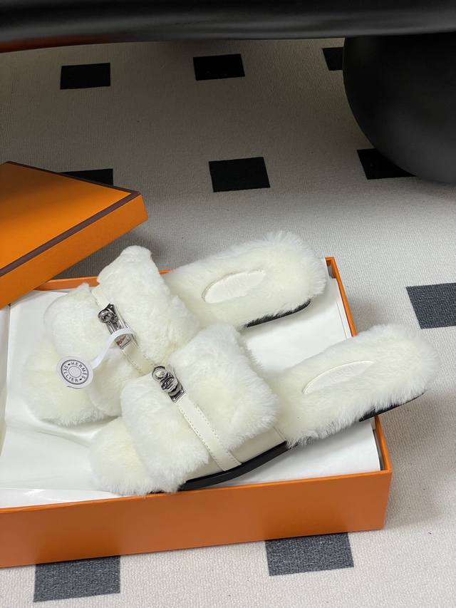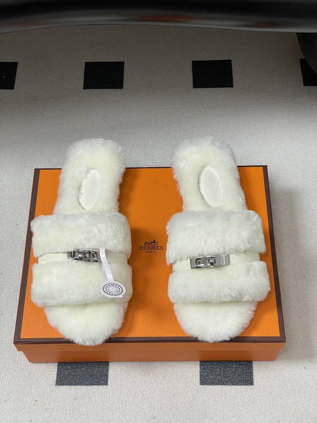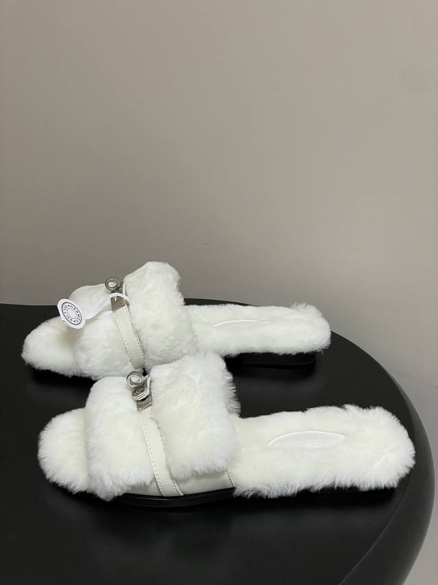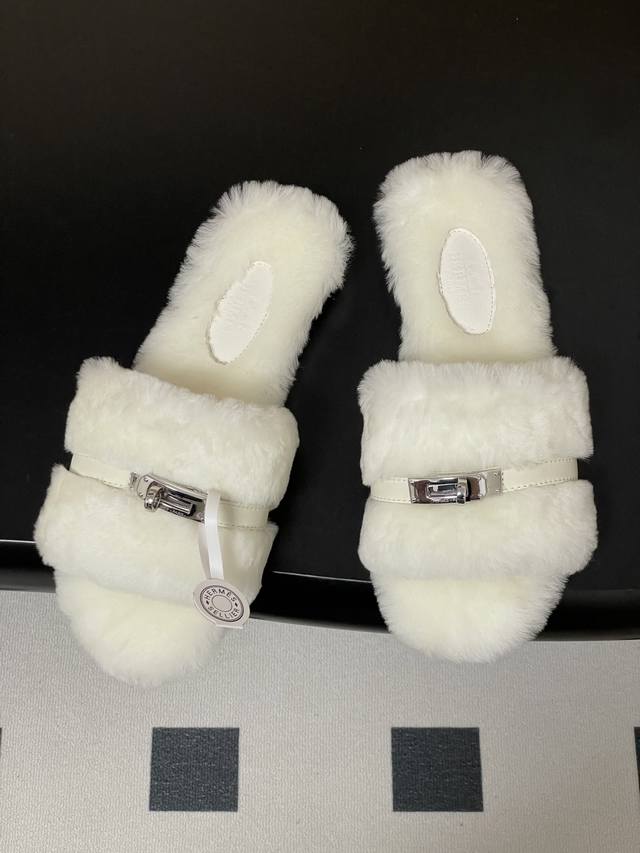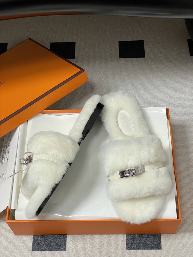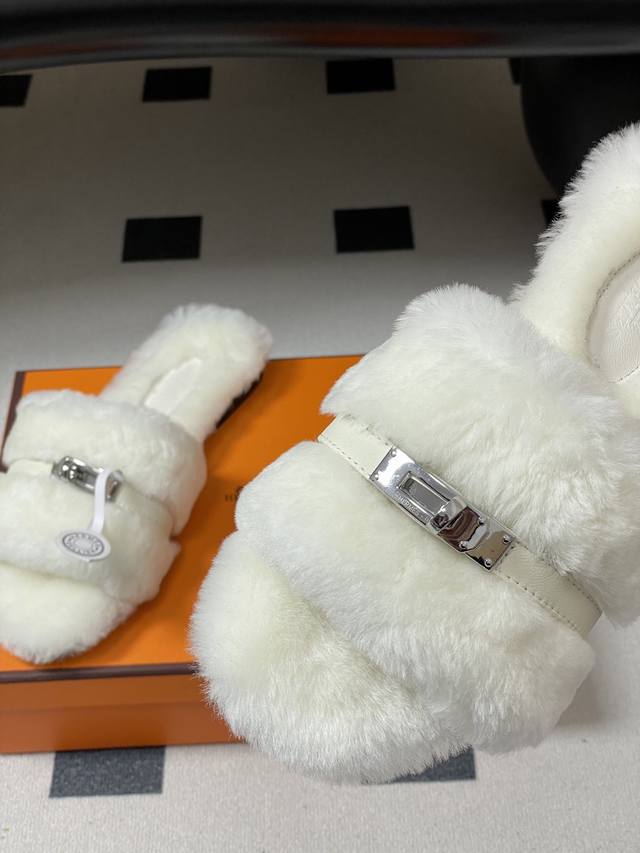 顶级品质 DDD Hermes 爱马仕 H家 Giulia毛拖系列Kelly扣H毛拖鞋 万年经典款羊毛‘H’拖鞋 DDD 经典H拖搭配Kelly扣更为亮眼!一双平底拖鞋,属于休闲舒适的鞋款类型,适合日常居家或者在一些轻松的场合穿着。这种拖鞋款式简约却又不失时尚感,兼具实用性与时尚度。 DDD 整体采用了羊毛材质,看起来非常柔软蓬松,不仅在视觉上给人一种温暖舒适的感觉,实际穿着时也能提供极佳的亲肤体验,尤其适合在较凉爽的季节或者想要营造温暖氛围感的时候穿着。这种毛绒材质的选择也体现了品牌在材质运用上的用心,