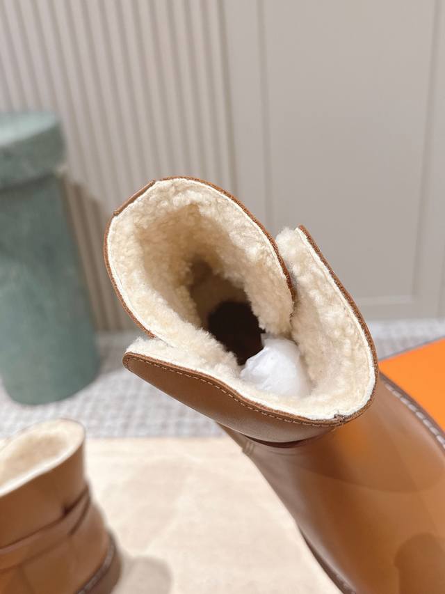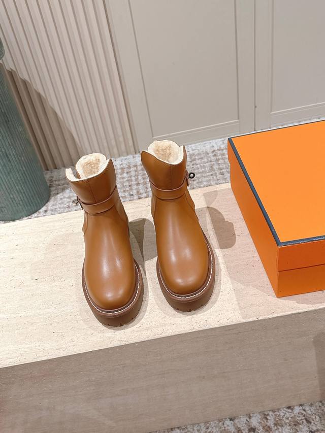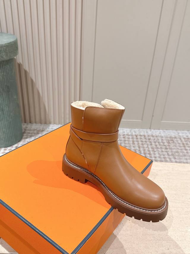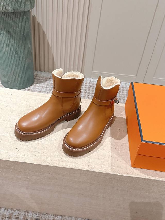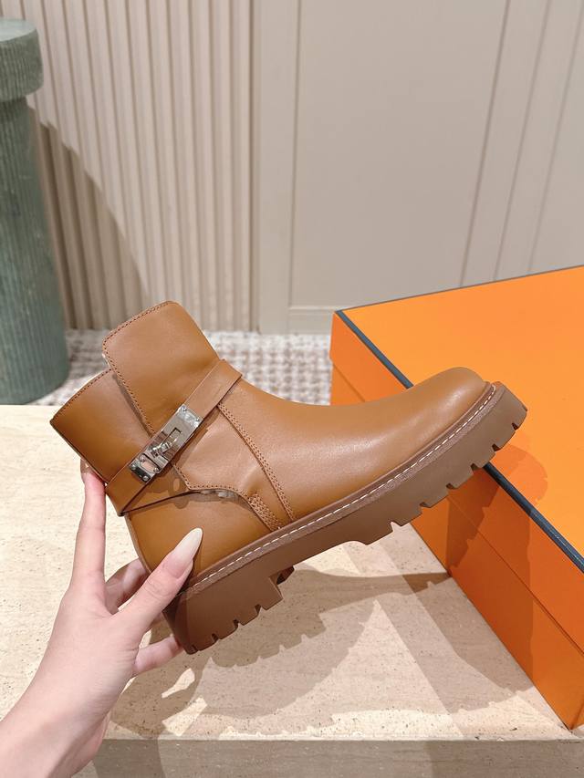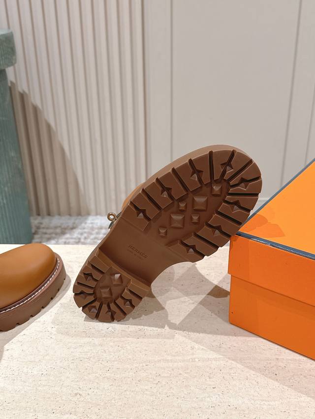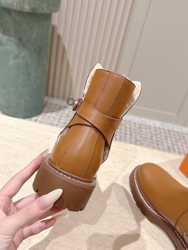 顶级版本: :Herme*25Ss 秋冬加绒款金属扣马丁靴 DDD 鞋身搭配金属扣饰绑带,既强化了设计感,又可通过调节绑带适配不同脚型与腿围,提升贴合度;品牌标志性的精致细节,彰显爱马仕的奢华辨识度。属于短筒靴型,靴筒高度适中,方便活动且能适度修饰脚踝线条; DDD 鞋底为厚底设计,在保障行走舒适度的同时,增添了几分利落感,适配秋冬各类穿搭。整体风格兼具奢华感与实用性,既能满足日常出行的保暖需求,又能提升造型的精致度与高级感。 DDD 鞋面:胎牛皮 胎牛绒 DDD 内里:羊毛 DDD 大底:Tpu大底真皮
