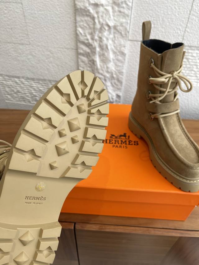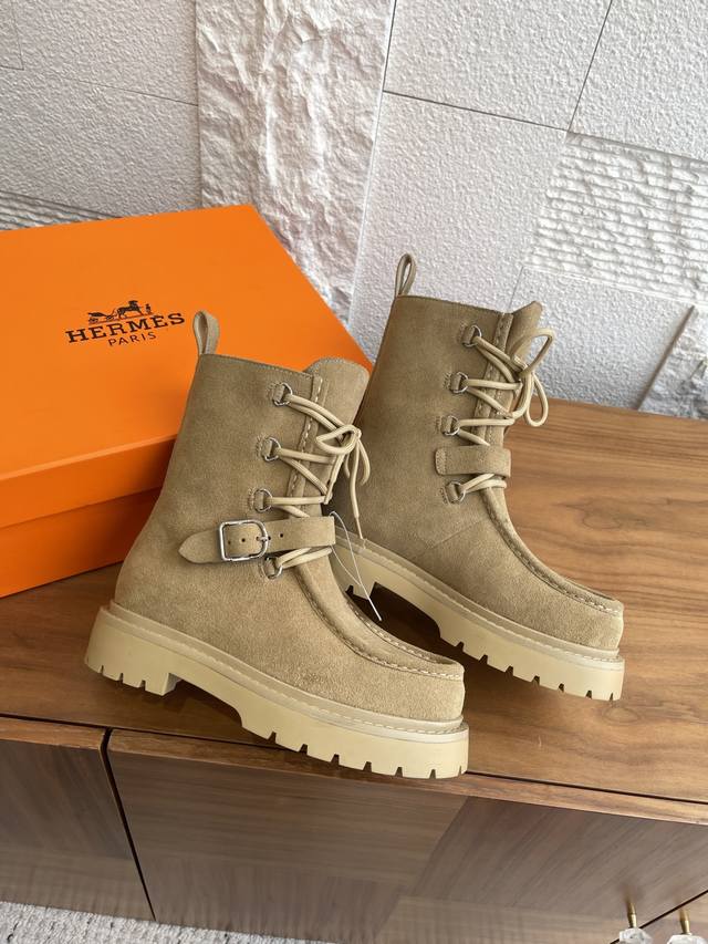 顶级版本: Hermes 爱玛仕 25Ss 秋冬新款 H家经典靴子 Land 及踝靴 马丁靴 H身独特的工艺和品质,这款Land及踝靴靴身采用顶级牛皮精制而成,纹理细腻富有光泽,延续爱马仕标志性皮革工艺。内里与鞋垫均选用柔软牛皮打造,亲肤透气,提供云端般舒适体验。厚底设计搭载防滑橡胶鞋底,提升穿着稳定性的同时,赋予步履间从容自信。 面料:进口麂皮绒 内里:进口牛皮里 大底:原版开模橡胶大底 Size:35-40 40定做不退换