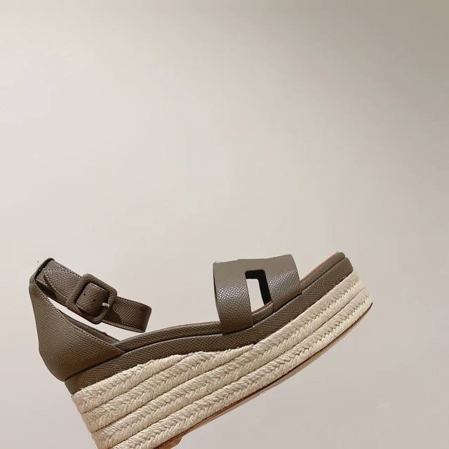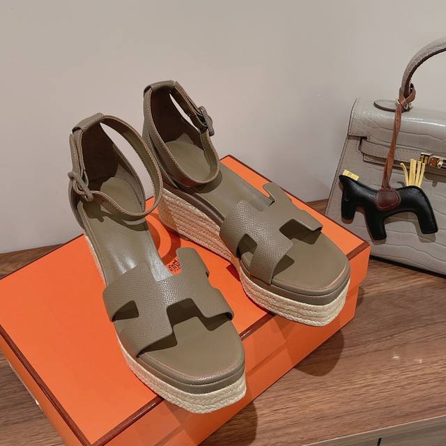 / Herme* H家 春夏新款Elda草编凉鞋 独家原版开发草编水台私模 万年经典百搭单品!纯手工制作顶级版本 欢迎对比 坡跟8.5Cm 水台高5Cm 鞋面小牛皮