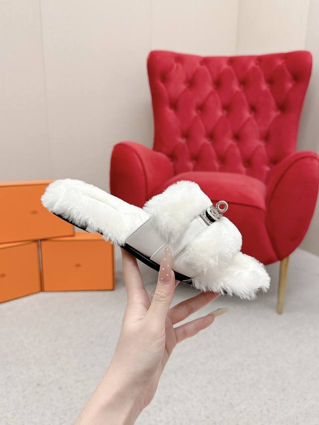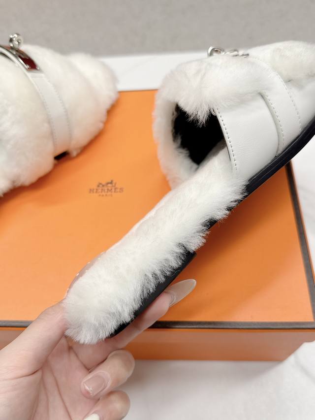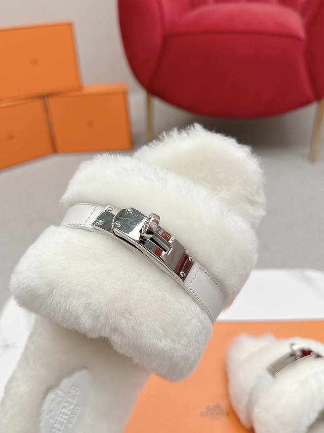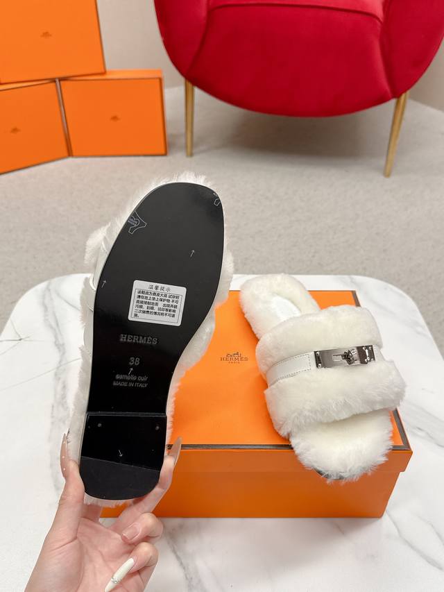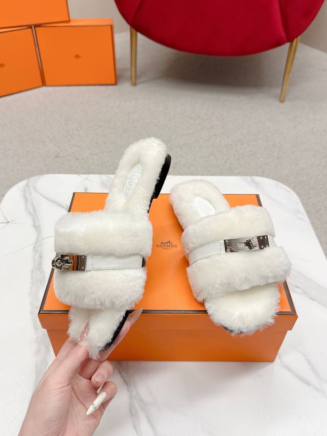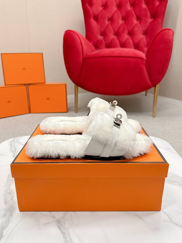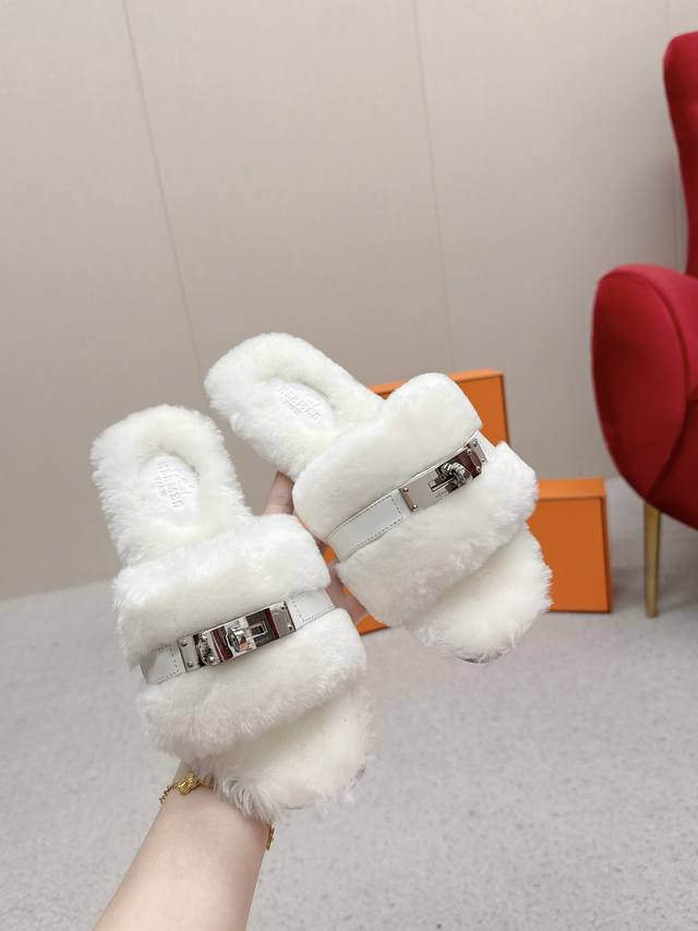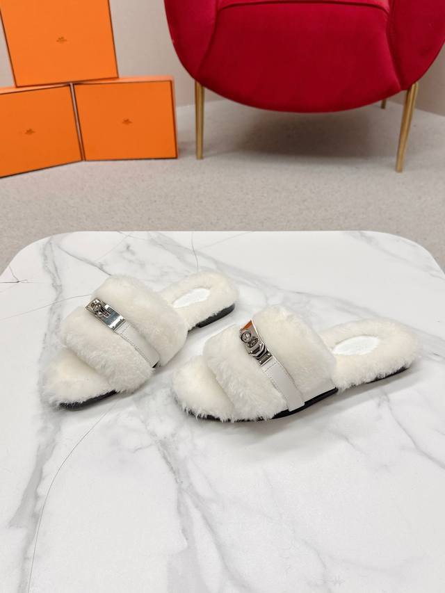 Hermes爱马仕 25 最新 秋冬 皮毛一体卷糕毛二舅拖 Keiiy锁扣缀于鞋面钯金镀层折射低调光绎 DDD 今年面料均选用羊羔毛 ,毛茸茸的 敲可爱的,踩云脚感,光脚或者搭配个袜子穿,都时髦的不行哦 DDD 搭配西装裤是职场的隐形战袍 呼应针织裙成慵懒下午标配衬以牛仔裤更显随性格调。 DDD 面料:羊毛 DDD 内里:进口羊羔毛 DDD 鞋底:原版真皮鞋底 DDD Size:#35-42 40.41.42定制 DDD