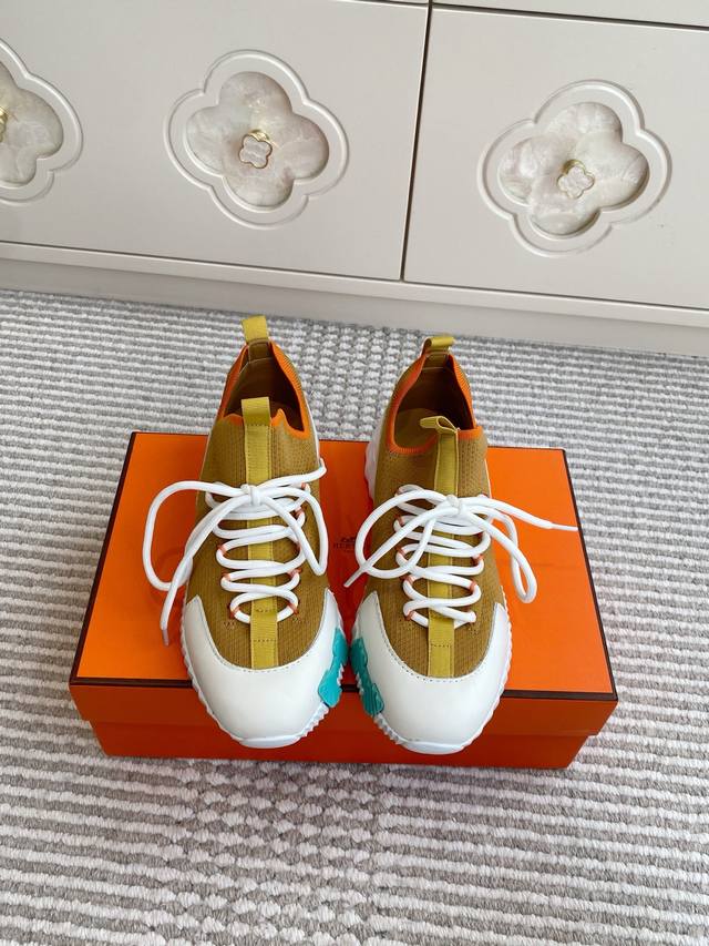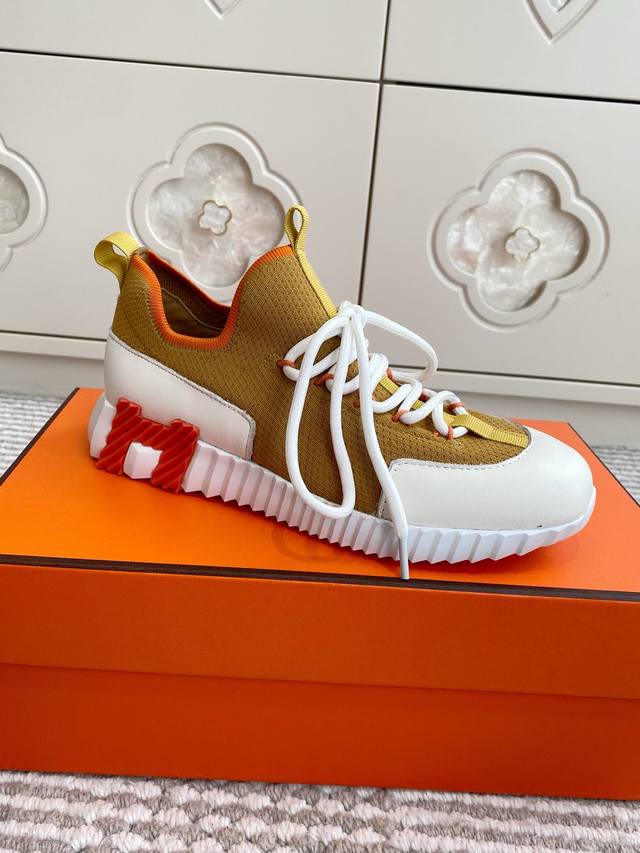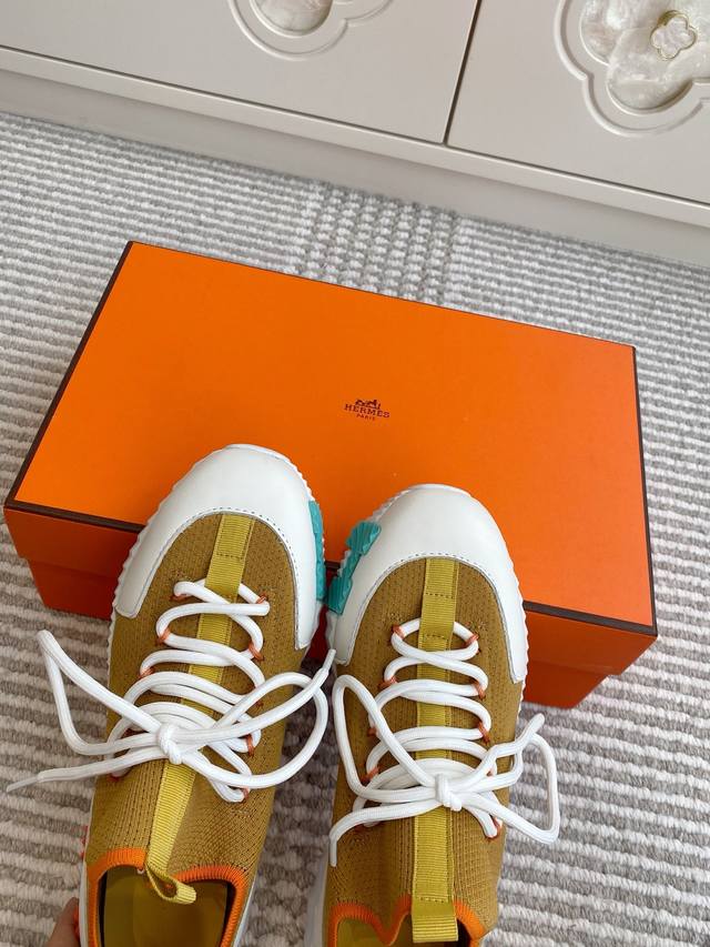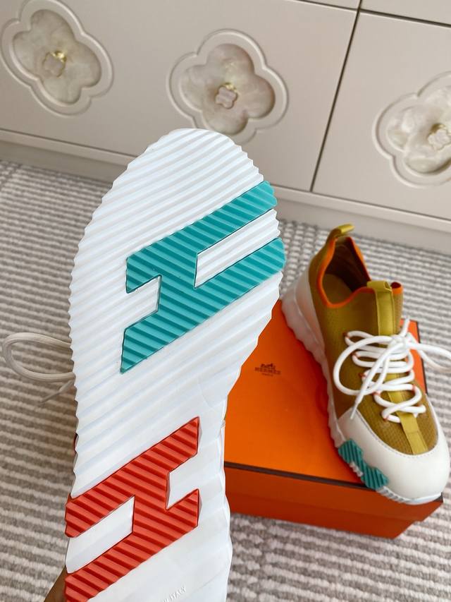 Hermes 爱马仕官网Bouncing情侣款H系带厚底运动鞋 DDD 顶级品质 DDD 工艺极致,同步专柜上新.鞋子的每一个细节都特别用心,相当惹眼,雅致的拼接元素,凸显不俗的气质! 时尚飞织系带方式,增添休闲的气息,精致的线条,无形之中能够更好体现出家族式的设计语言,穿插精致的线条,完美契合脚型,自然的勾勒出时尚的轮廓,达到视觉上的冲击效果,充分演绎不一样的运动风格! DDD 面料进口高丝光羊绒 雨布 飞织面 牛皮 内里透气网布,垫脚混种羊皮,脚感舒适,Ip Tpu 大底,德国技术照射机无缝组合 轻便