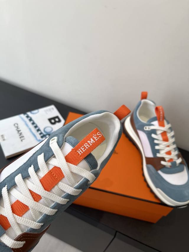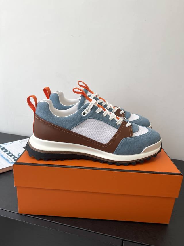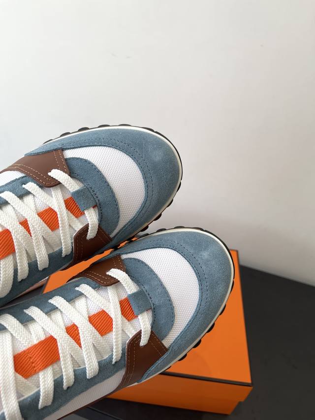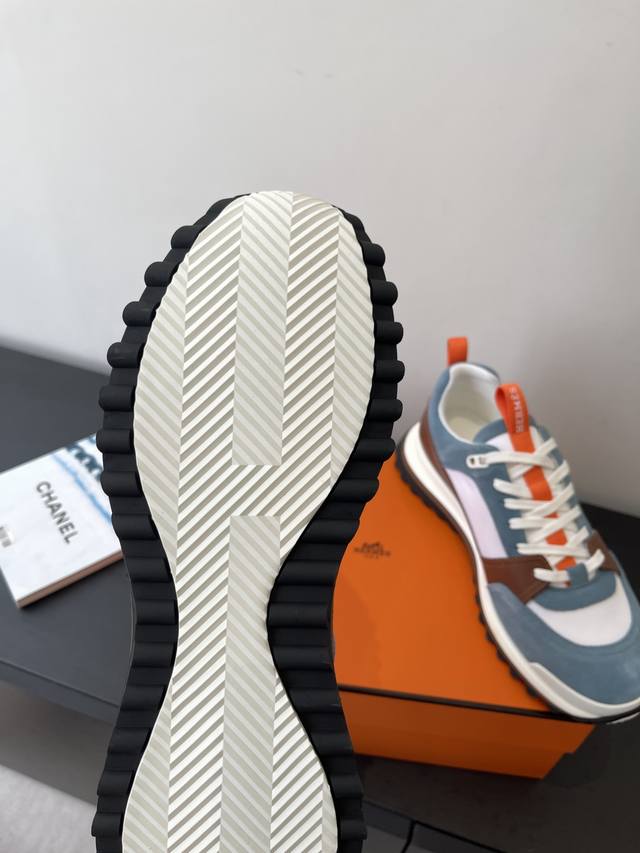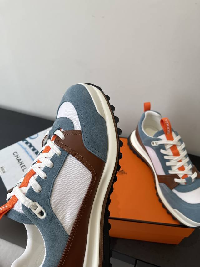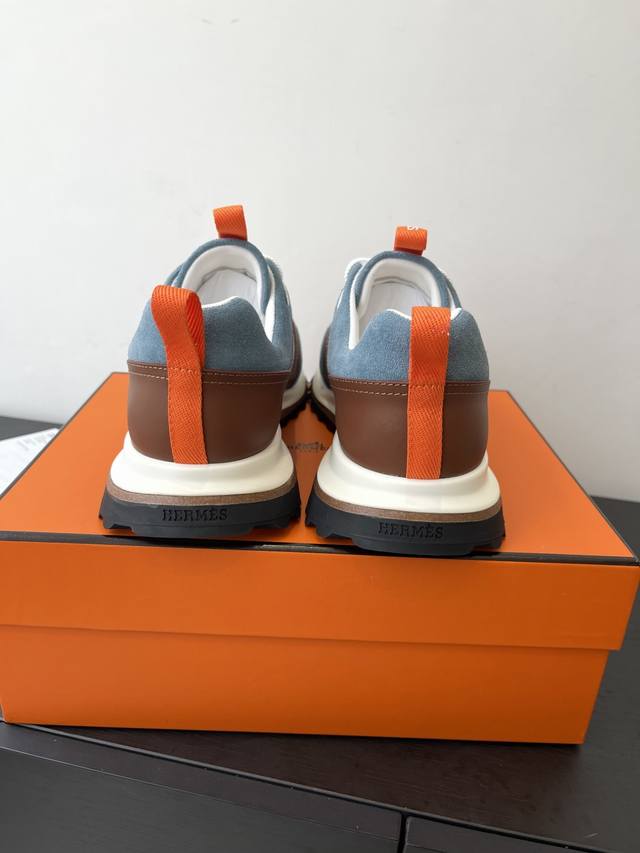 Hermes 爱马仕 新品 男款 休闲运动鞋 鞋面纳帕小牛皮 反绒羊京皮 品牌高丝光帆布鞋舌 后跟 品牌Logo织带 垫脚水染牛皮 超轻Tpu发泡 橡胶 双色成