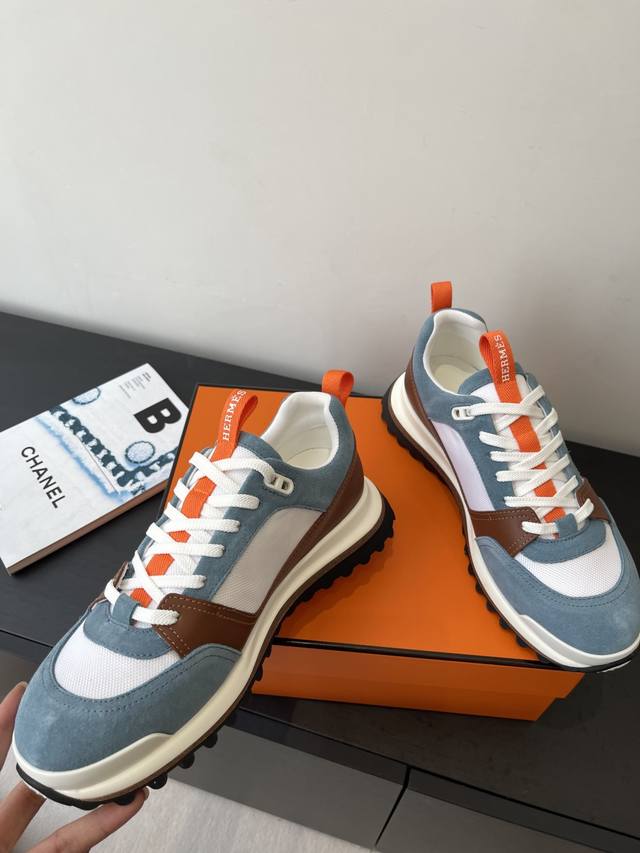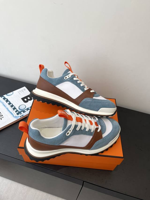 Hermes 爱马仕 新品 男款 休闲运动鞋 鞋面纳帕小牛皮 反绒羊京皮 品牌高丝光帆布鞋舌 后跟 品牌Logo织带 垫脚水染牛皮 超轻Tpu发泡 橡胶 双色成型大底 超高品控 做工精细凸显 高端 贵气 档次 码数:39-45