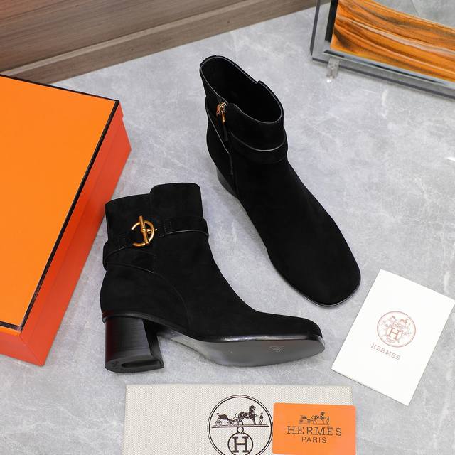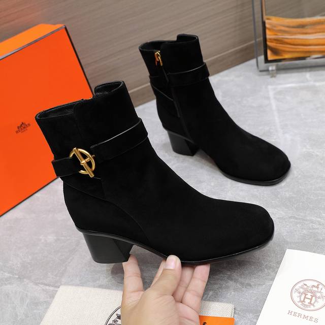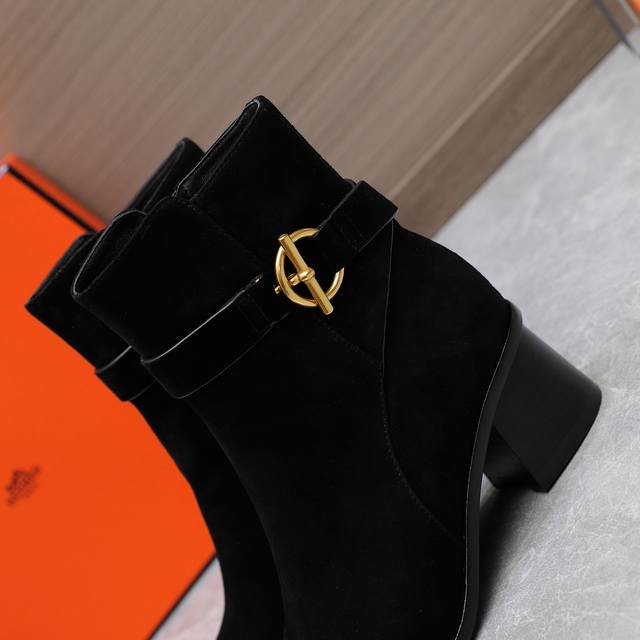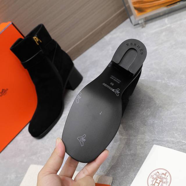 Hermes 爱马仕 秋冬 Frenchie Kelly 扣短靴 DDD 精选上乘头层Heritage小牛皮,细腻质感透着不言而喻的高级感,圆头设计添了几分柔美与亲和力,搭配功能性镀把Kelly鞋扣更是点睛之笔, DDD 后跟高约5厘米展现优雅而不失力量的女性魅力,真皮大底承载着对品质的不懈追求。每一次出门都是对优雅致敬,每一步都闪耀着低调奢华光芒。 DDD 鞋面:头层小牛皮 进口高丝光牛反绒 DDD 内里:牛皮内里 DDD 跟高:5Cm层皮跟 DDD 筒高:约10厘米 DDD 鞋底:加厚意大利真皮底+真