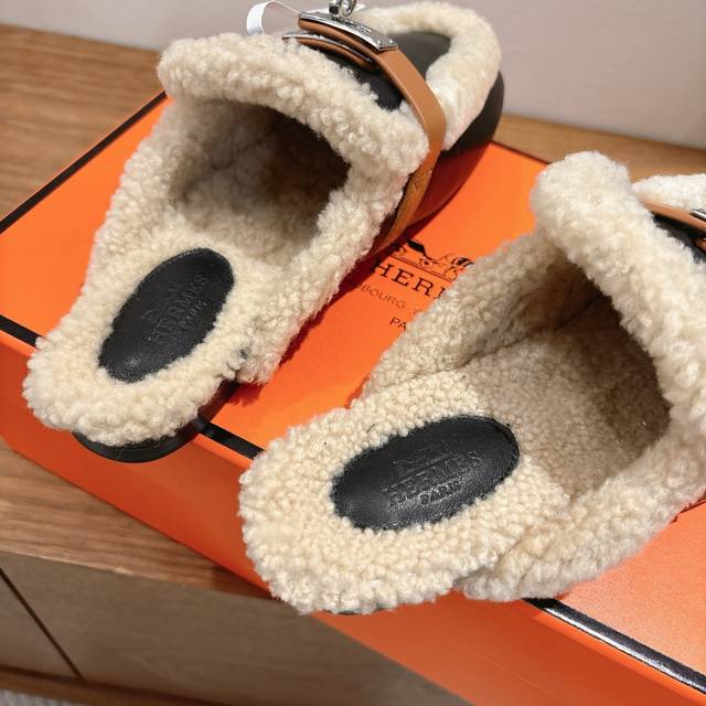 男款20顶级版本爱马仕秋冬新款H型情侣款毛拖 皮毛一体卷糕羊毛材质,超nice...