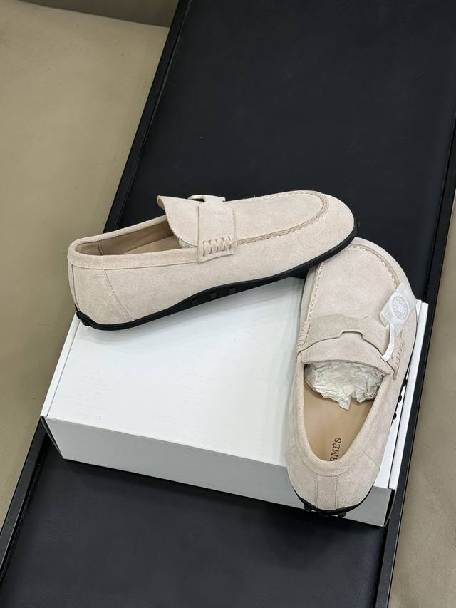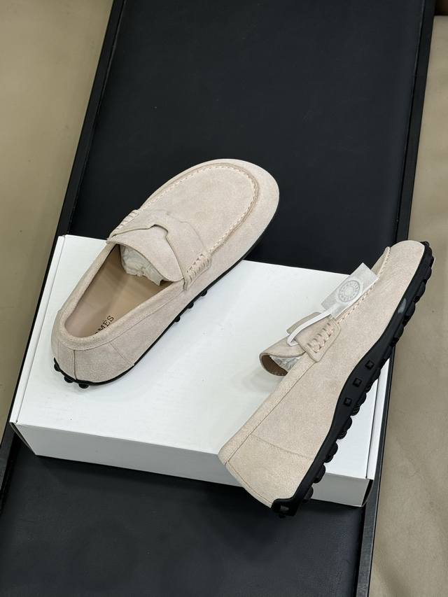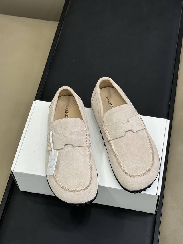 Hermes Fw25 Ne Arrival~ DDD 秋冬复古麂皮乐福鞋 DDD 乐福鞋款式,设计经典百搭,一脚蹬的样式方便穿脱,适合多种场合穿搭。品牌标识:鞋款带有爱马仕标志性的设计元素,彰显品牌身份。 DDD 采用麂皮材质,质感细腻,触感柔软,兼具舒适与高级感。提供丰富的色彩选择,包括深棕、黑色、米白、浅棕等,满足不同风格和搭配需求。做工精细,缝线工整,细节处体现品牌的精湛工艺,保证了鞋子的品质和耐用性。 DDD 面料胎牛绒,水染羊皮里,Tpu大底 DDD Size:35-45 男码+10 DDD