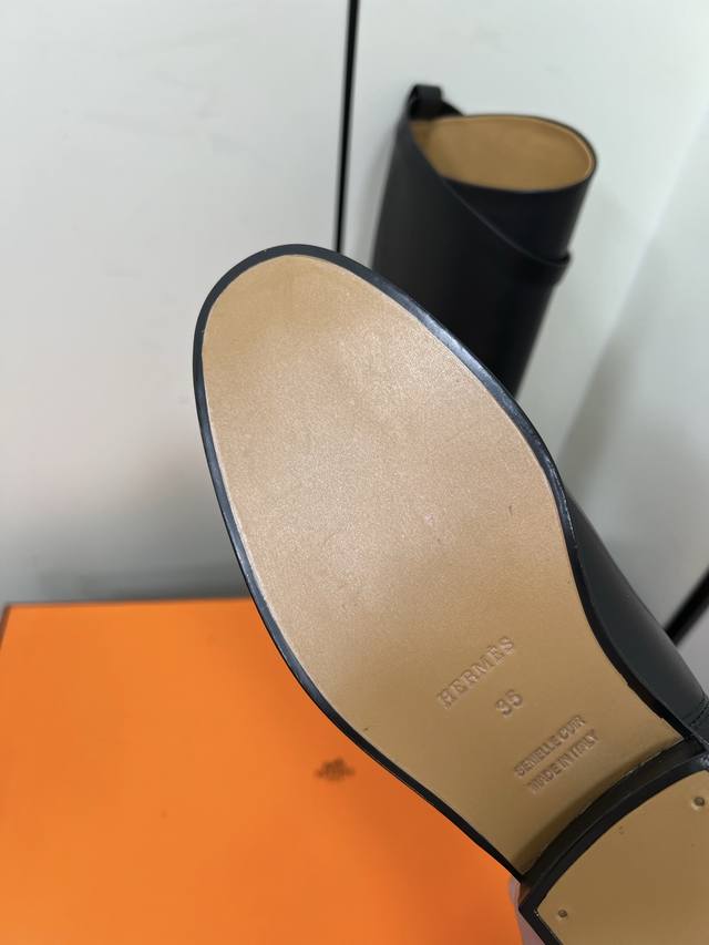 秋冬新款 爱马仕半拖 麂皮山羊皮高跟穆勒鞋,搭配凹槽鞋底,饰有镀钯标志性“H”细节,打造时尚休闲的风格。...