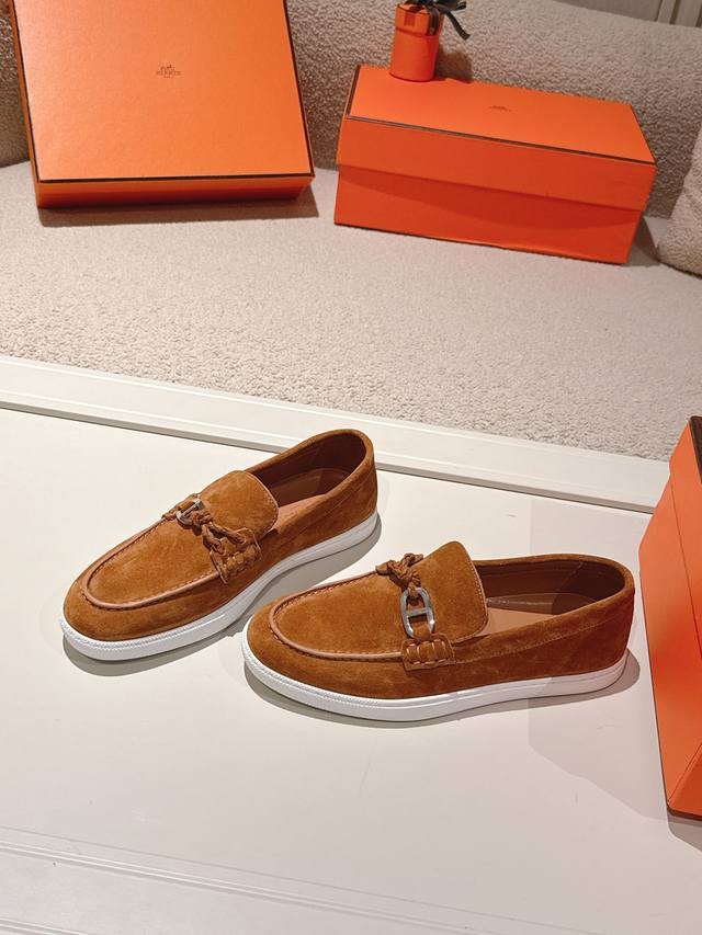 Hermes# Lgnacio系列 情侣款 乐福鞋 休闲 运动鞋 原版购入开发 做货 这款小牛皮乐福鞋,饰有皮革编绳和“Chaine D'ancre”鞋扣 时尚航海风格乐福鞋,是陆地和海滨的理想选择 配送专柜精美包装 面料 : 原版定制进口头层牛皮 牛反绒 内里 : 进口柔软羊皮里 鞋底 : 原版开模防滑Tpu材质 底厚 :2Cm 码数:35-35
