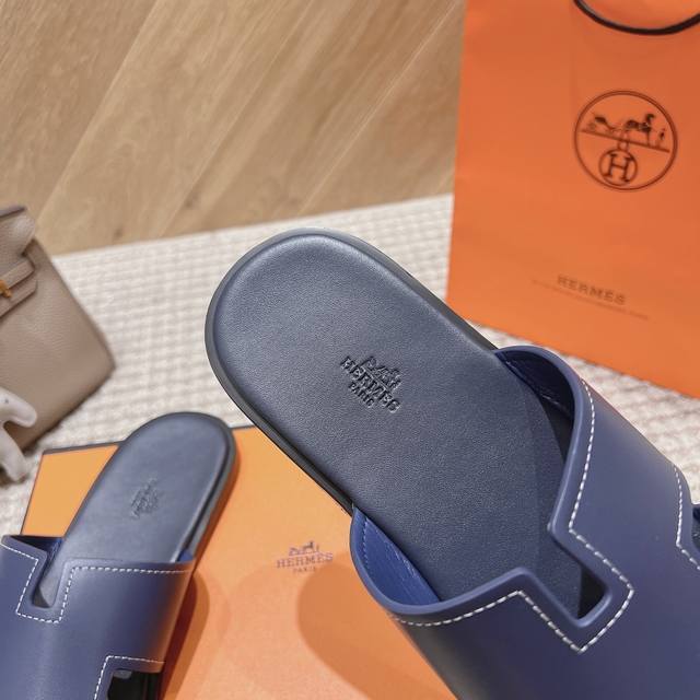 Hernes深蓝色爱马仕真皮面料、羊皮里、高端H男拖意大利耐磨真皮大底、市场急需货源:手工精细。原版复制、码数:39-46, 38.39.、45、46订制不退不