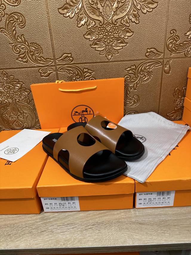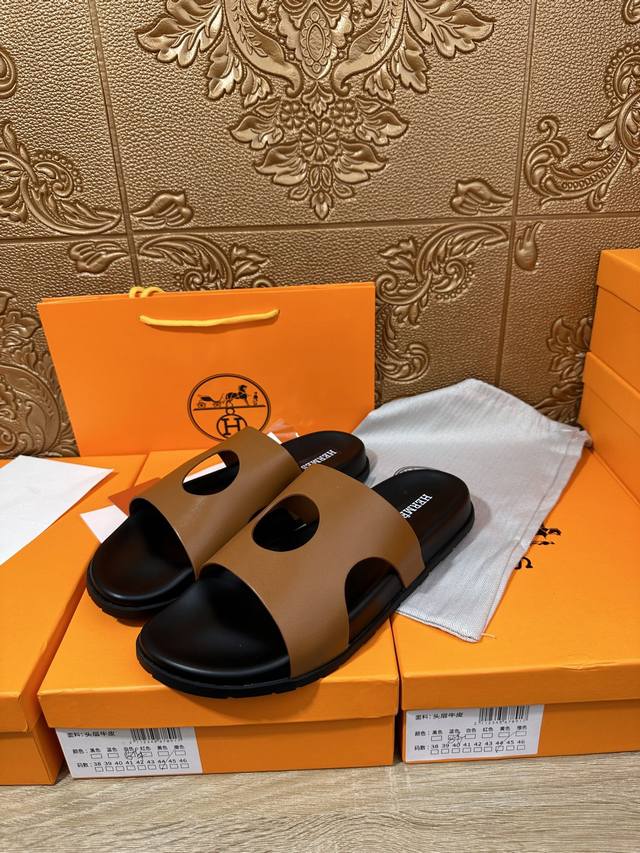 出厂价 Hermes爱马仕 官网最新专柜同步新款oran牛皮面h拖鞋 巴黎原版飞回正品开模完美打造最高品质 诚意巨献,可随意进出专柜鞋面采用原版牛皮。多色可选。进口皮垫脚内里,意大利最新原版大底,码数:38-46