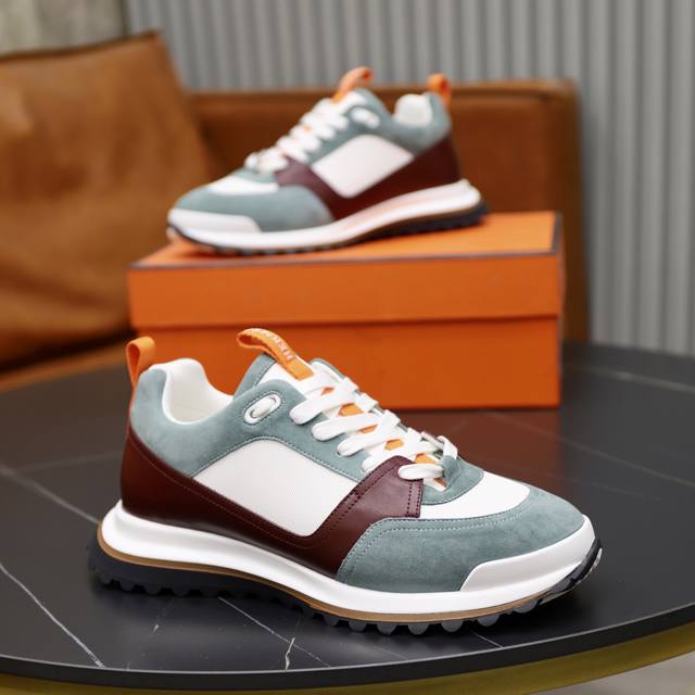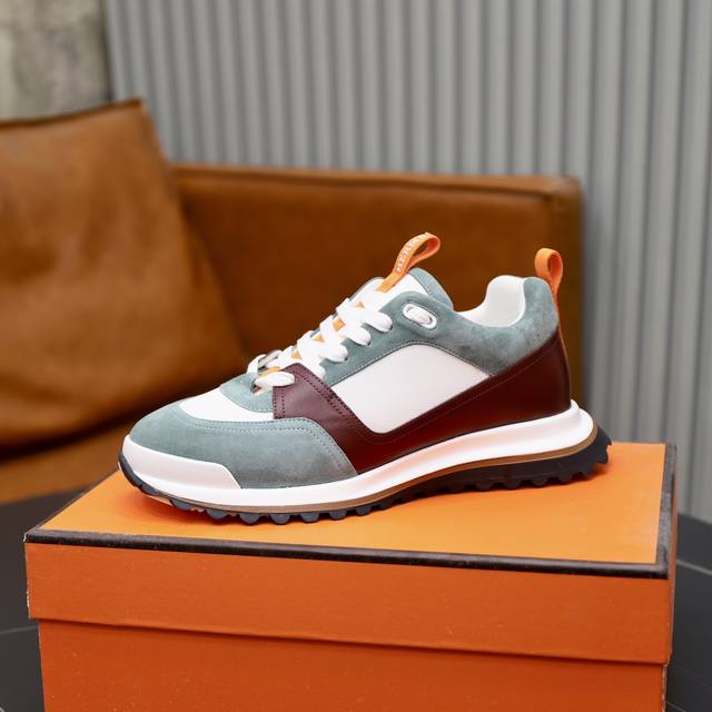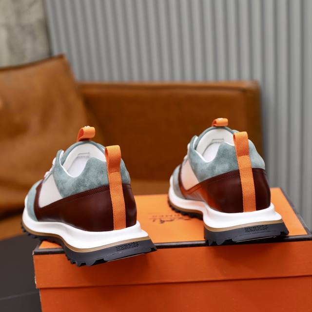出厂价Pp: Hermes 爱马仕 Leader运动鞋! 多色拼接高科技斜纹、小牛皮和麂皮山羊皮运动鞋。轻盈几何鞋底,打造时尚都市造型。 产品详情: 白色和橙色橡胶鞋底 黑色橡胶鞋底,橙色橡胶嵌饰浅自然色皮革嵌饰白色橡胶鞋头 牛皮垫脚 网布 内底和内衬 棉质饰带,橡胶字样 鞋底高度:4Cm 尺码:39-40-41-42-43-44 38.45订做