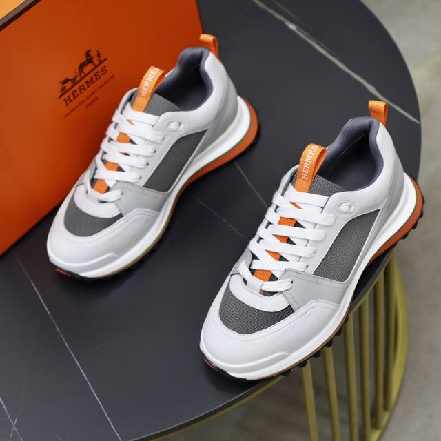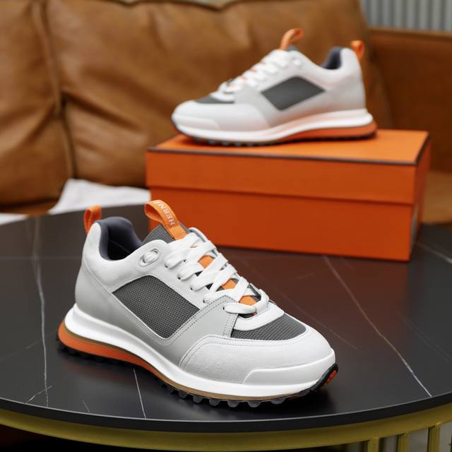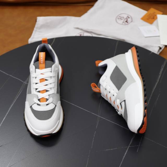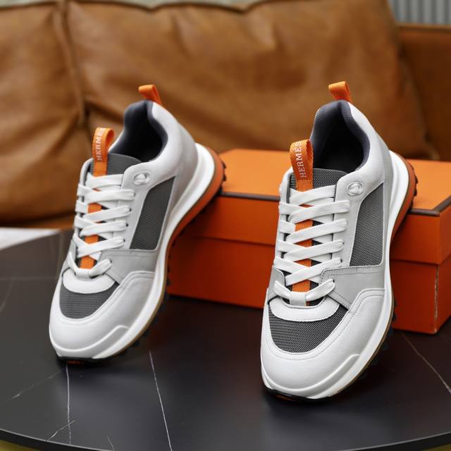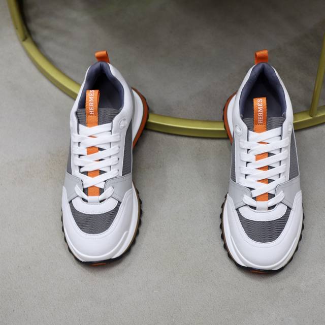出厂价Pp: Hermes 爱马仕 Leader运动鞋! 多色拼接高科技斜纹、小牛皮和麂皮山羊皮运动鞋。轻盈几何鞋底,打造时尚都市造型。 产品详情: 白色和橙色橡胶鞋底 黑色橡胶鞋底,橙色橡胶嵌饰浅自然色皮革嵌饰白色橡胶鞋头 牛皮垫脚 网布 内底和内衬 棉质饰带,橡胶字样 鞋底高度:4Cm 尺码:39-40-41-42-43-44 38.45订做