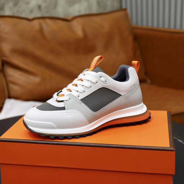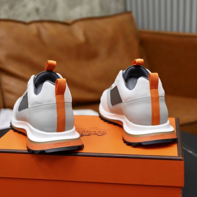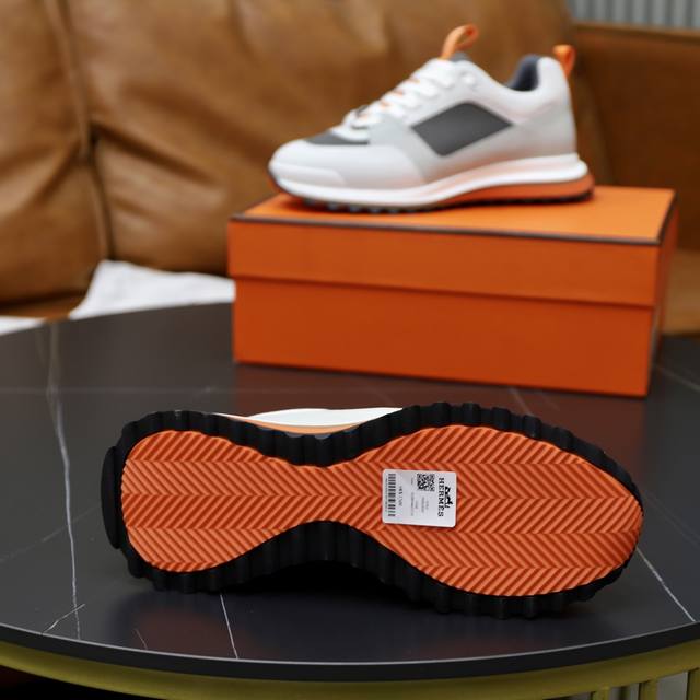 / 出厂价Pp: Hermes 爱马仕 Leader运动鞋! 多色拼接高科技斜纹、小牛皮和麂皮山羊皮运动鞋。轻盈几何鞋底,打造时尚都市造型。 产品详情: 白色和橙色