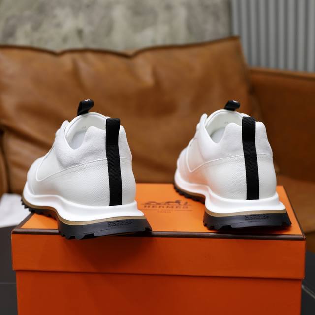 / 出厂价Pp: Hermes 爱马仕 Leader运动鞋! 多色拼接高科技斜纹、小牛皮和麂皮山羊皮运动鞋。轻盈几何鞋底,打造时尚都市造型。 产品详情: 白色和橙色