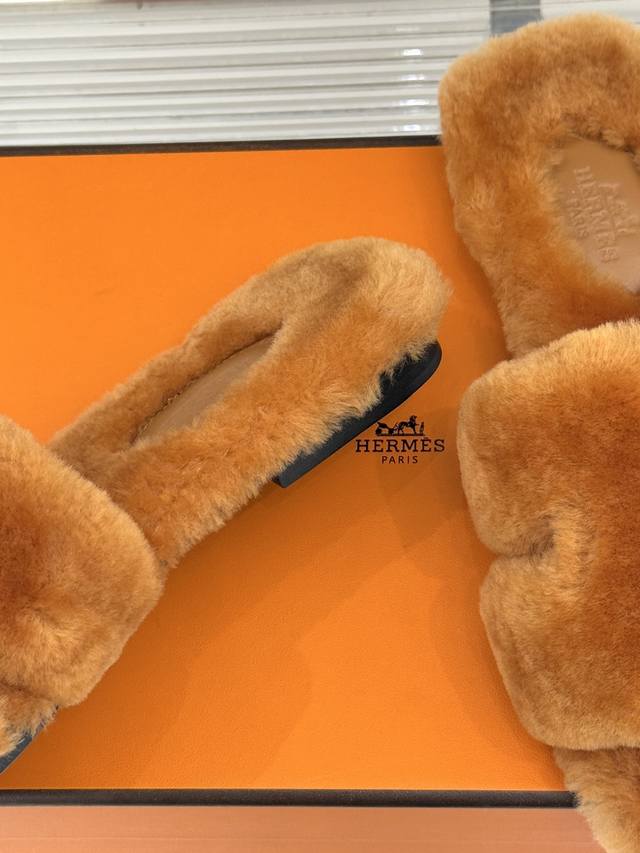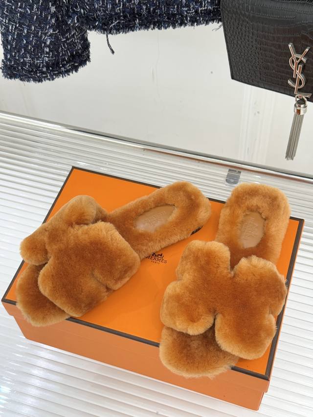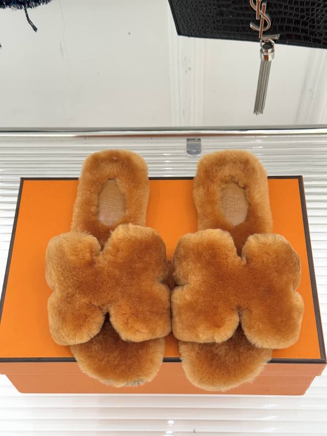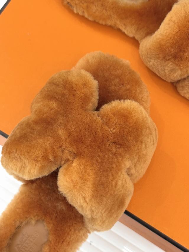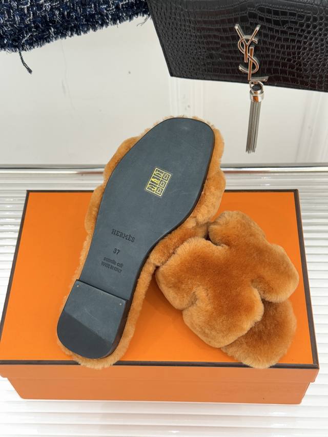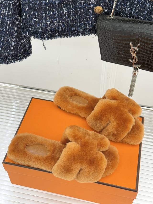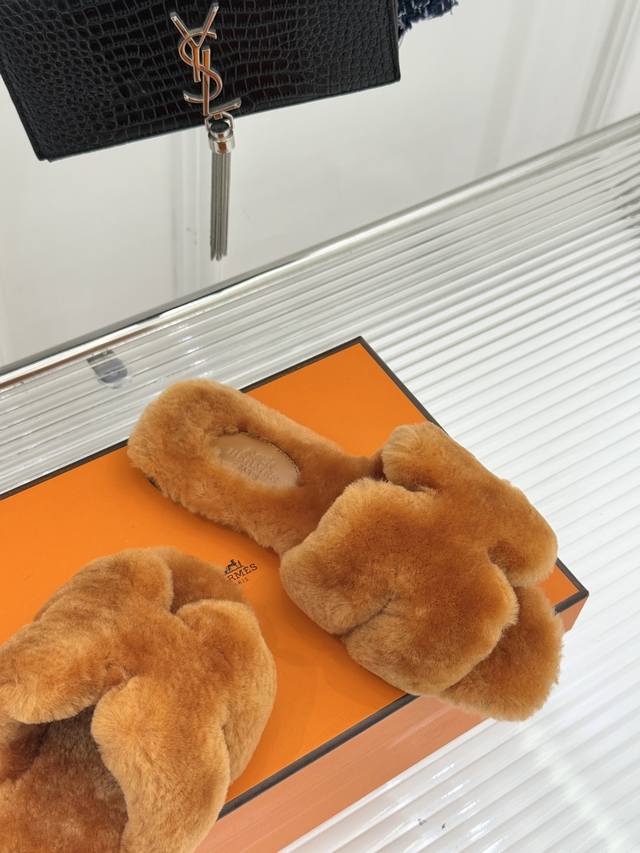 厂价 Herme*经典H毛毛拖鞋 王炸的H拖 懒人必备 经典的简约H造型 品牌辨识度极高 颜值和脚感兼备 实物上脚特别好看 显瘦显白显气质 超级精致有档次的贵妇拖鞋 澳洲进口羊毛 上脚舒适度爆赞 意大利进口牛皮大底 Size:35-39 40 41 42定制