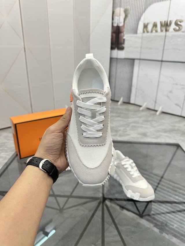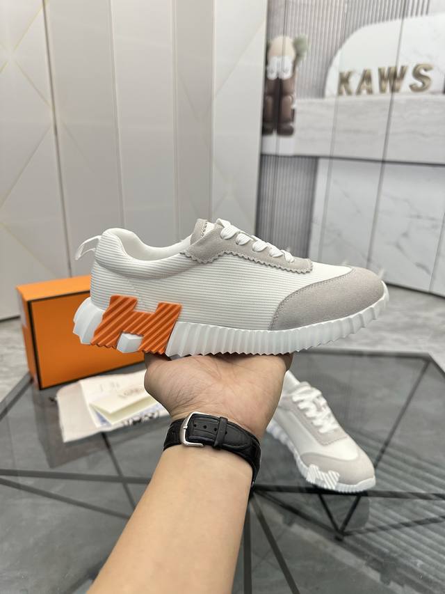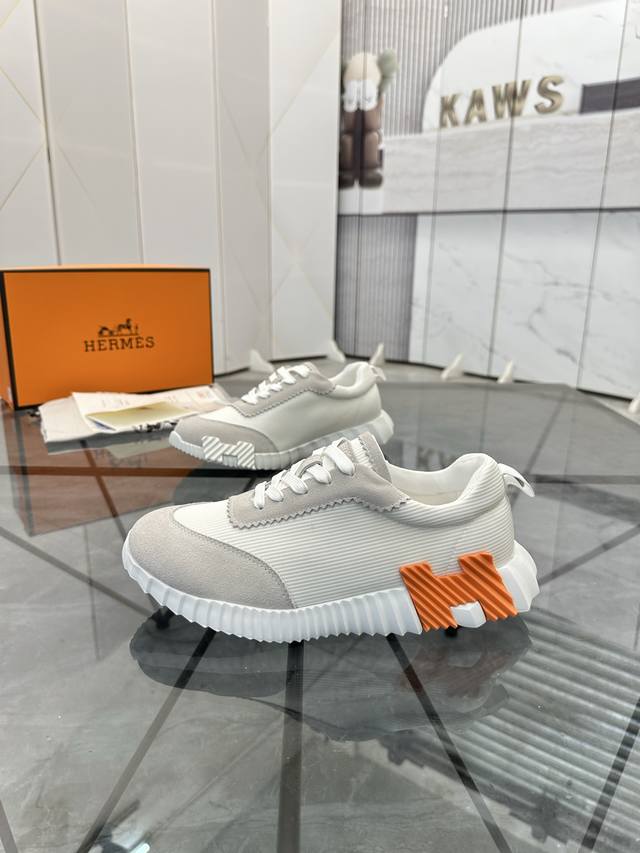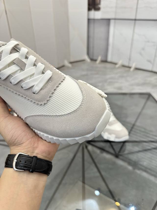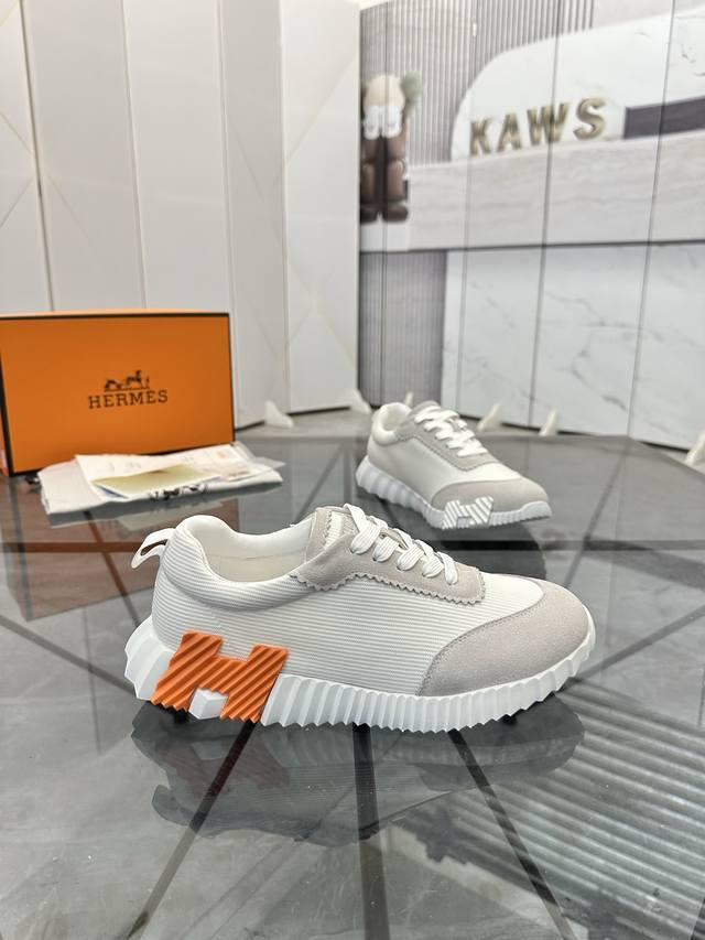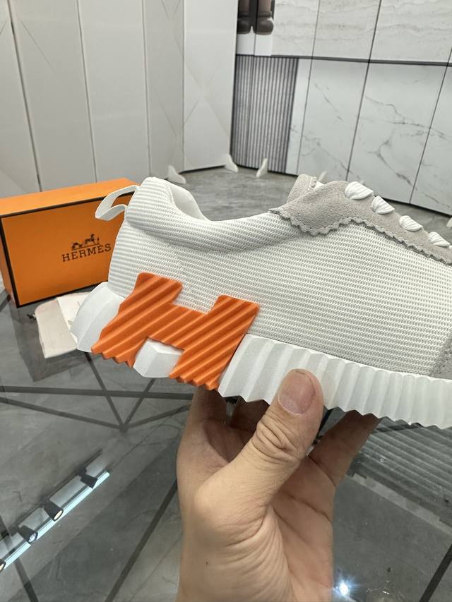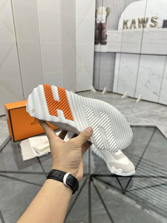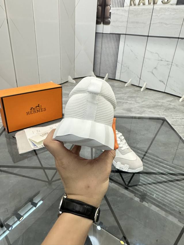 p Hermas爱马仕运动鞋,鞋面小牛皮和网布拼接打造,进口材质,质感十足,轻盈鞋底装饰撞色图案,打造百搭时尚风格。...