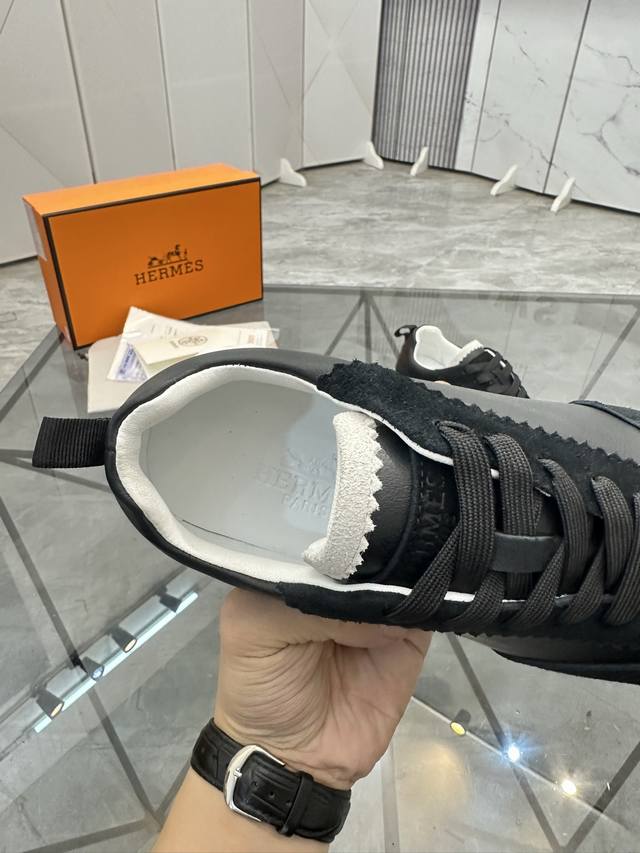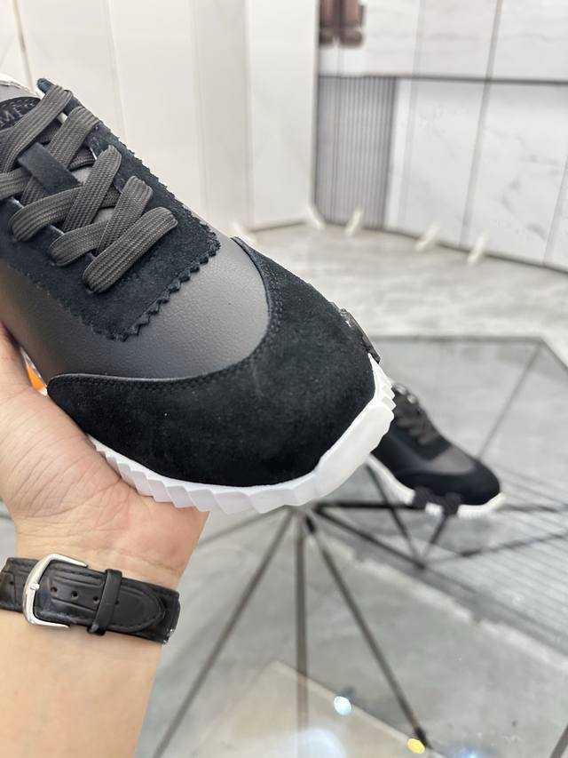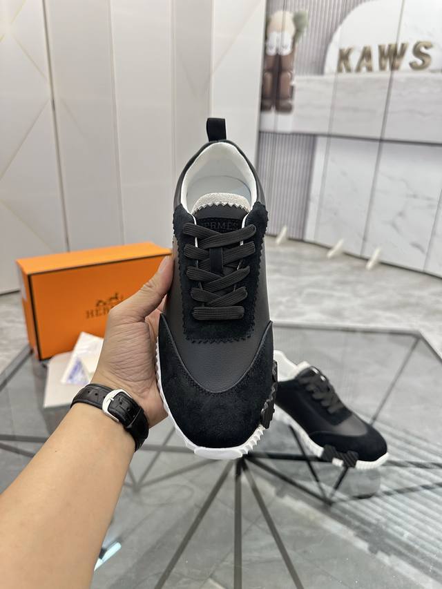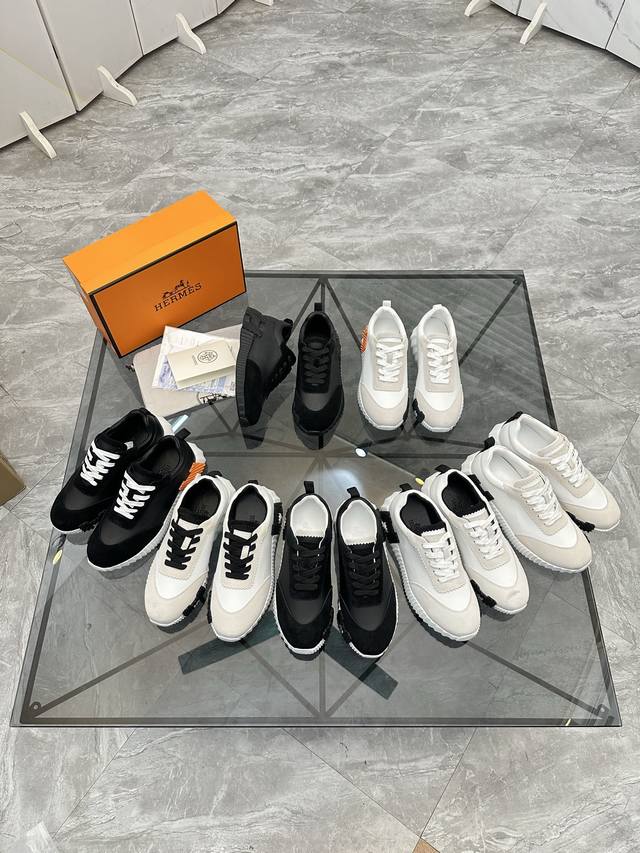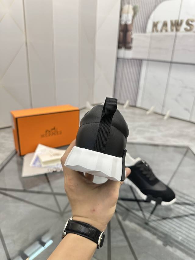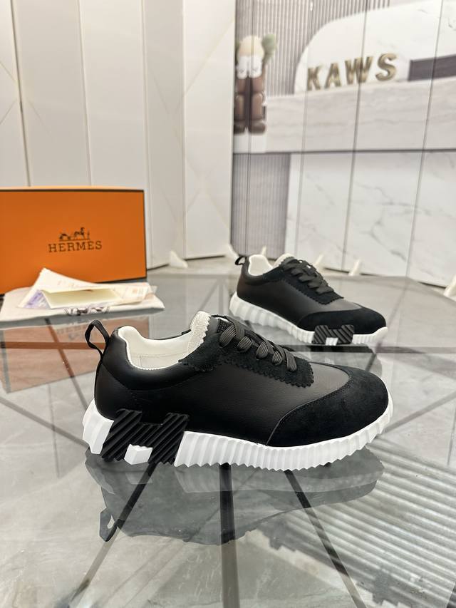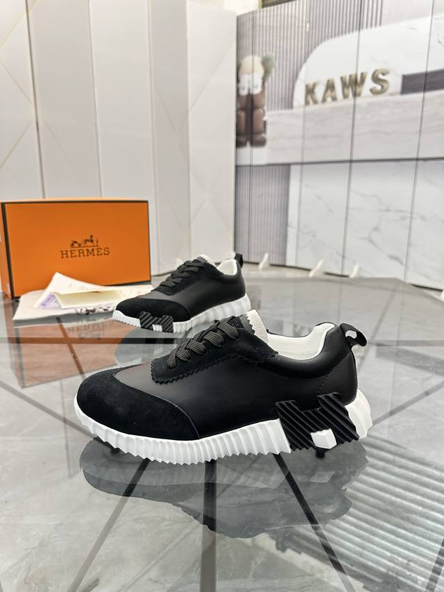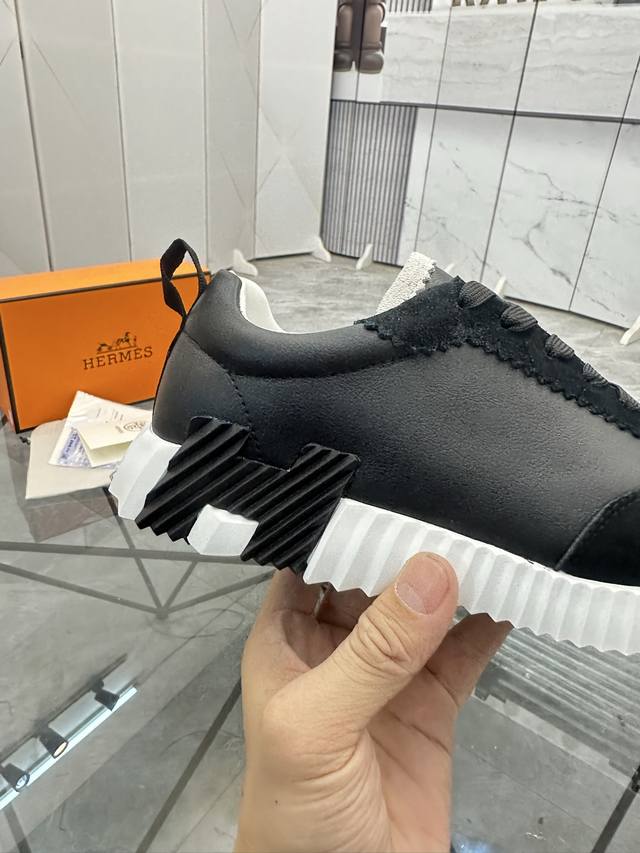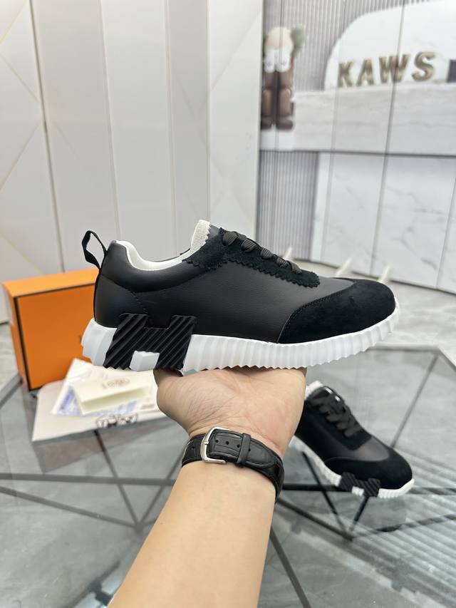 H爱马仕Bouncing运动鞋,男士休闲运动鞋,鞋面牛皮拼接高端网布打造,进口材质,质感十足,轻盈鞋底装饰撞色图案,打造百搭...
