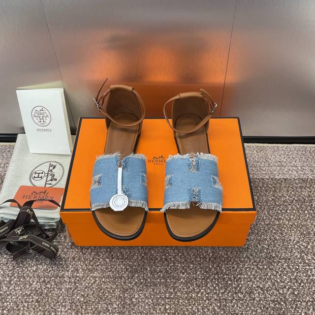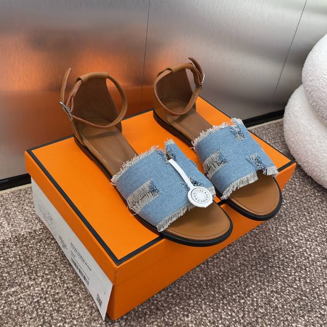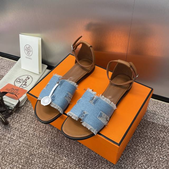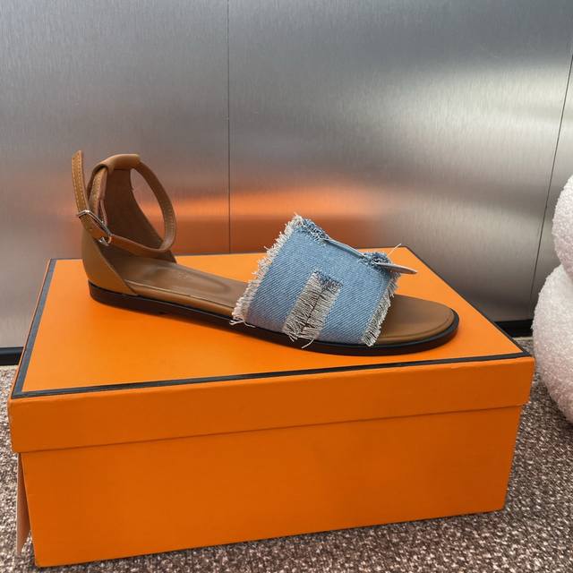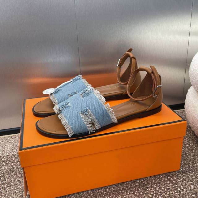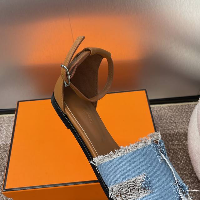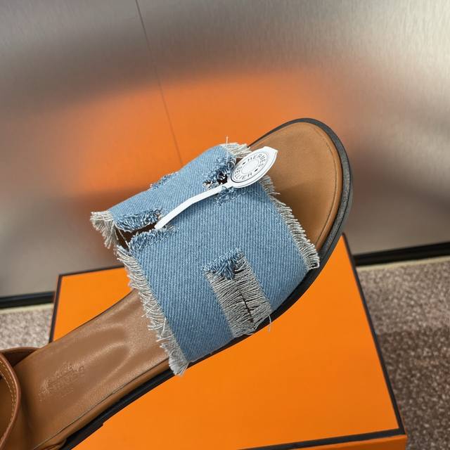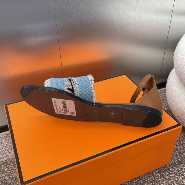 工厂价 爱马仕 Hermes 春夏经典款 Santorini 拼色工字拖女鞋 H家平底圆头一圈带露趾中空凉鞋 材质:进口小牛皮+水洗工艺牛仔布+水染羊皮水里+意