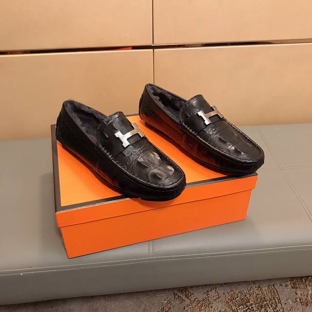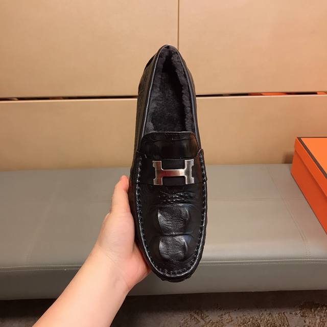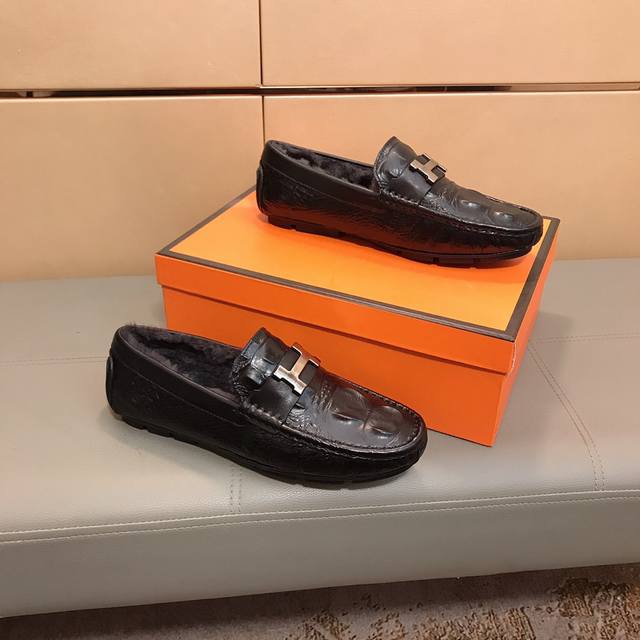 工厂P价 爱马仕 男士秋冬休闲豆豆鞋,全新款上市,采用进口意大利牛皮高温压纹+品牌饰扣,保暖羊毛内里制作,橡胶耐磨大底,潮男订制,百搭款,配码 38-44 DD