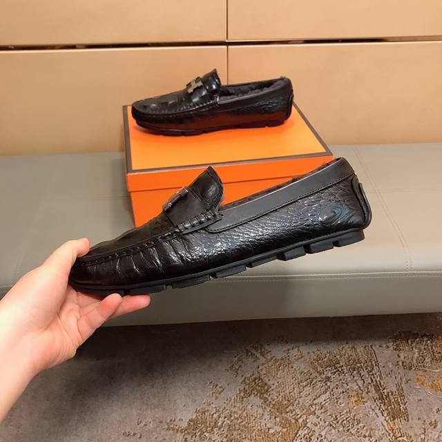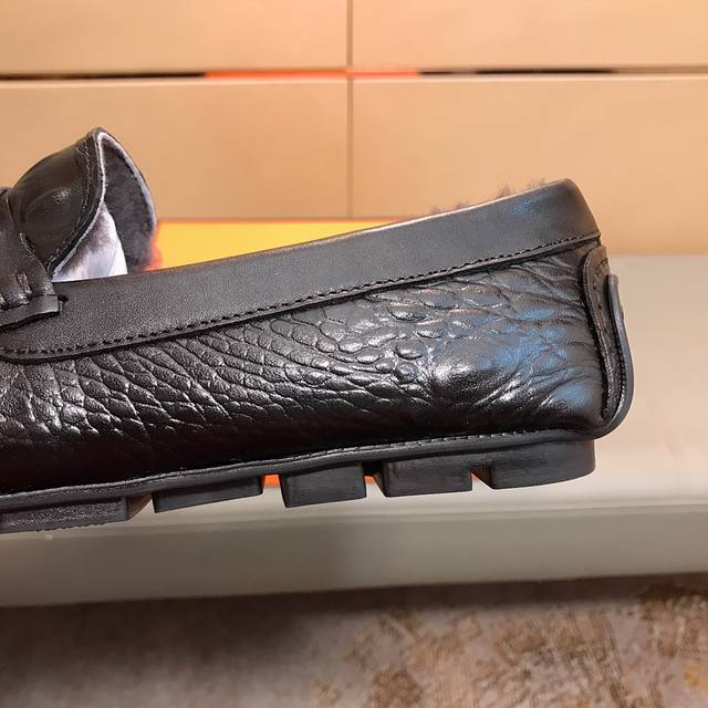 FFF 工厂P价 爱马仕 男士秋冬休闲豆豆鞋,全新款上市,采用进口意大利牛皮高温压纹+品牌饰扣,保暖羊毛内里制作,橡胶耐磨大底,潮男订制,百搭款,配码 38-44 DDD