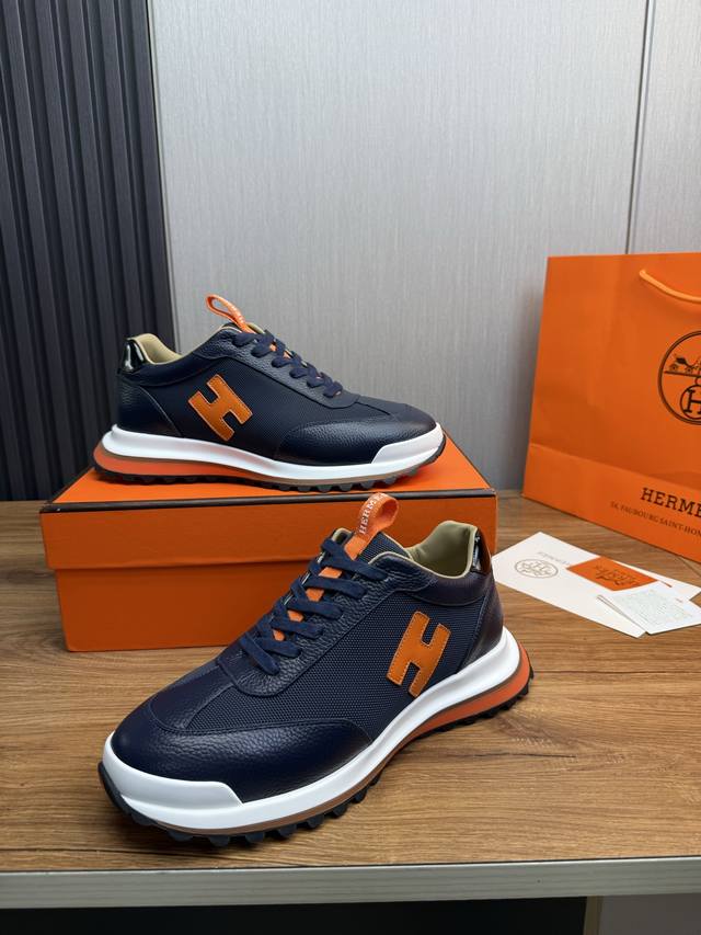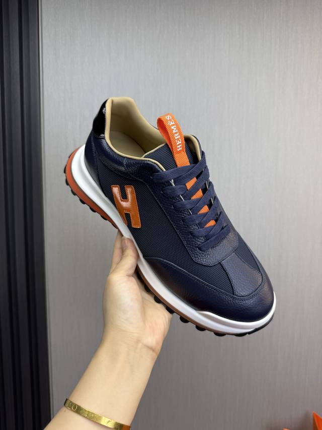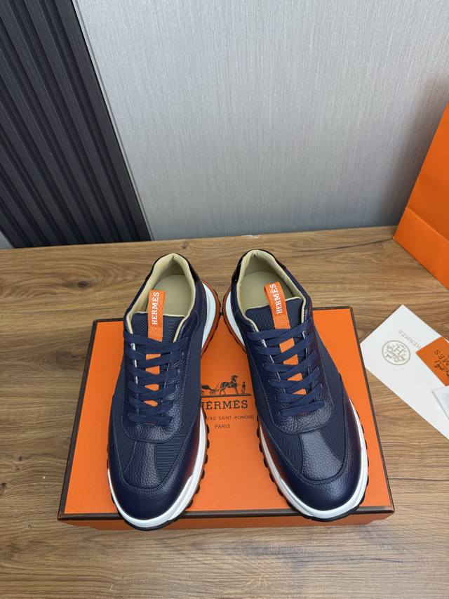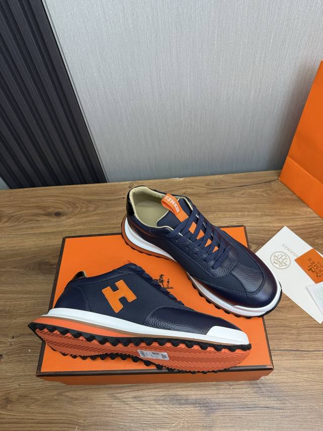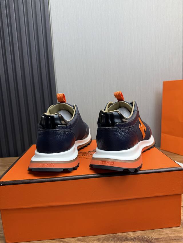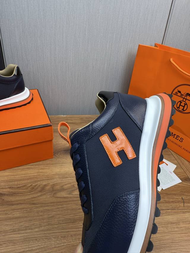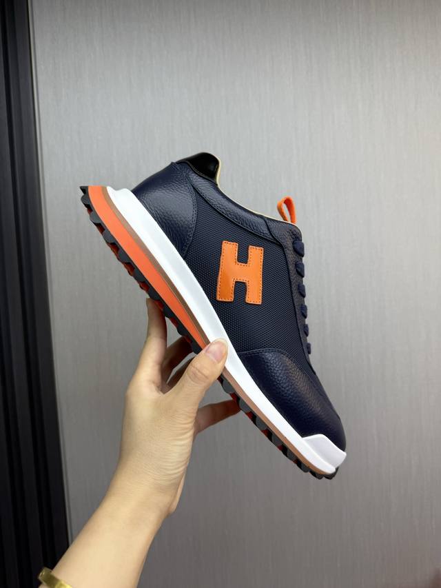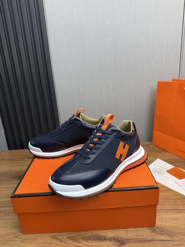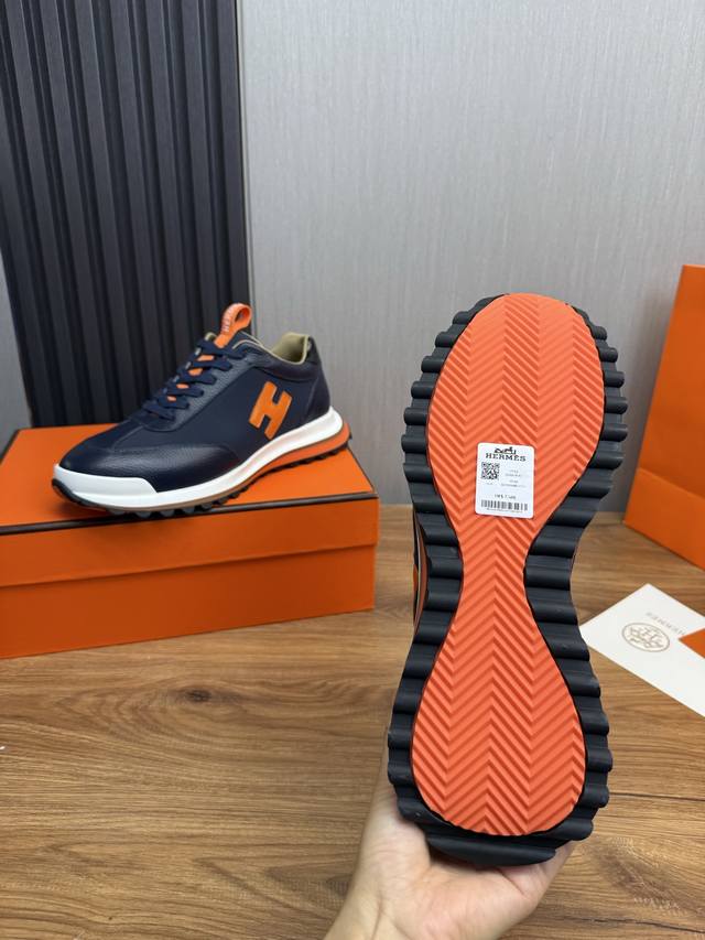 工厂P价 Hermes 爱马仕 Leader运动鞋! 多色拼接高科技斜纹、小牛皮和麂皮山羊皮运动鞋。轻盈几何鞋底,打造时尚都市造型。 产品详情: 白色和橙色橡胶鞋底 黑色橡胶鞋底,橙色橡胶嵌饰浅自然色皮革嵌饰白色橡胶鞋头 米色羊羔皮内底和内衬 棉质饰带,橡胶字样 鞋底高度:4Cm 尺码:39-40-41-42-43-44 38.45订做