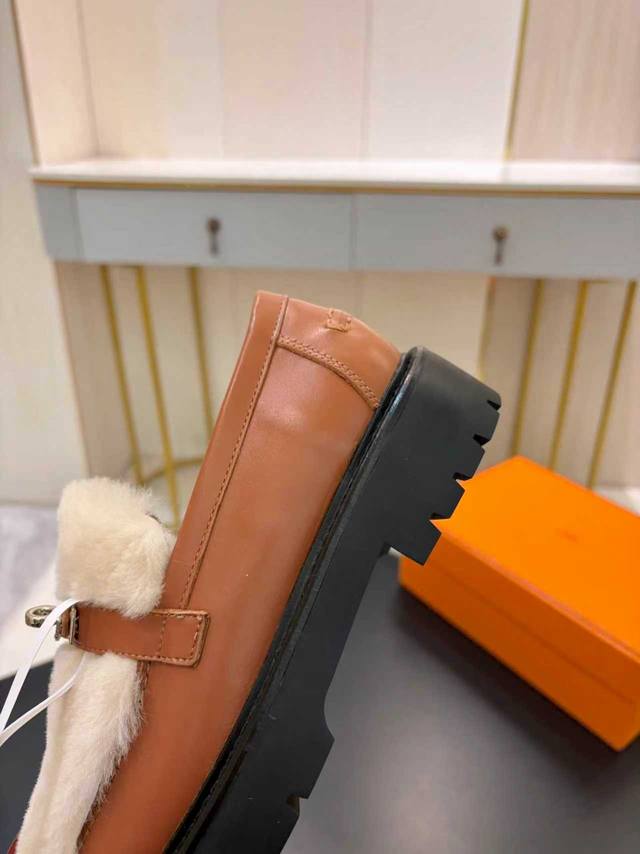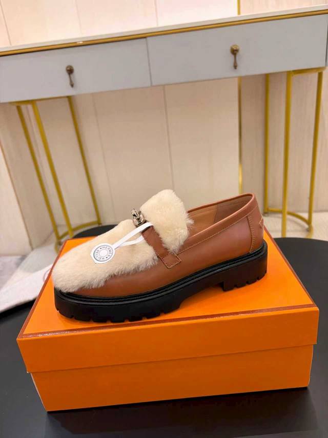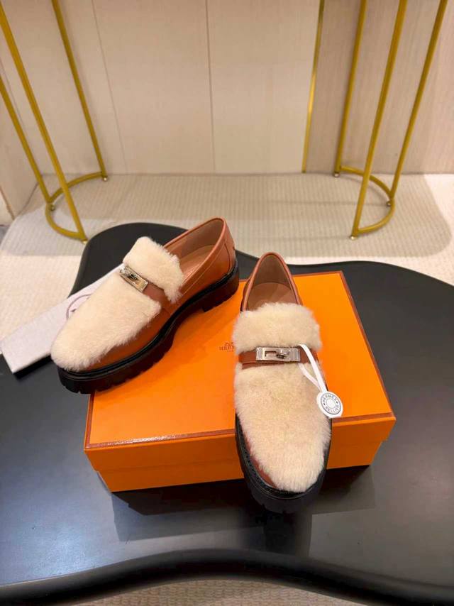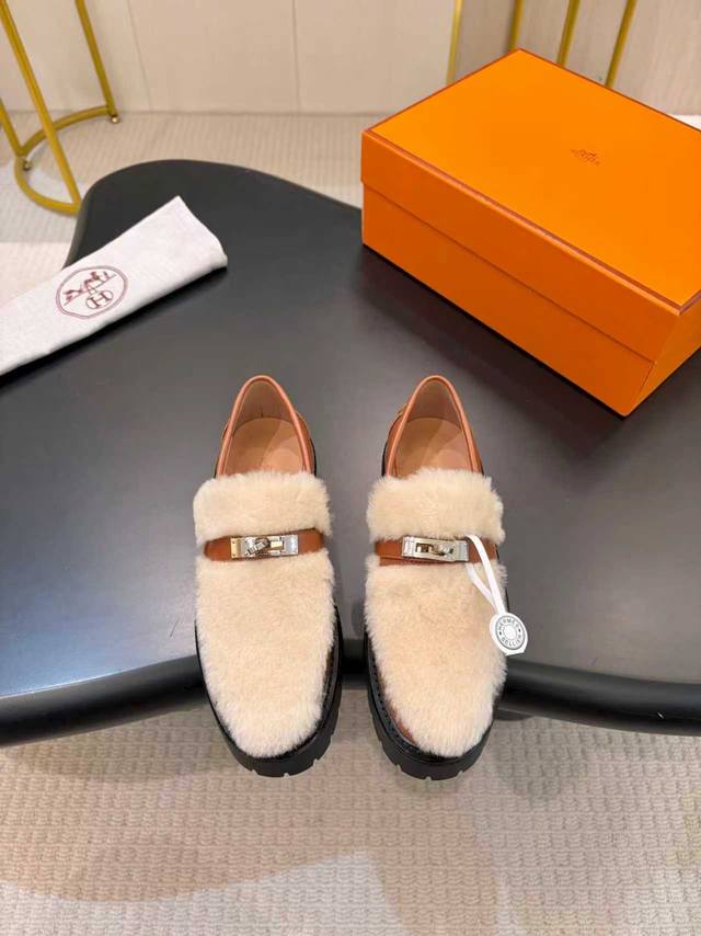 爱马仕 Hermes 2025秋冬新款 Kelly扣 Lcone拼色低跟女鞋 H家厚底圆头时尚休闲乐福鞋 材质:鞋面进口小牛皮+水染牛皮内里+原版开模组合大底