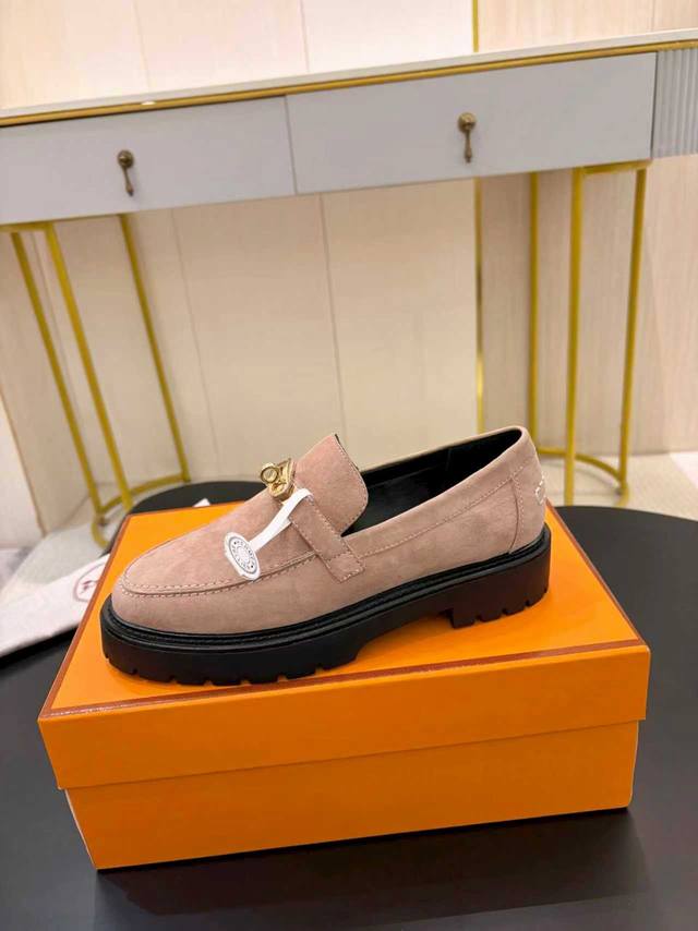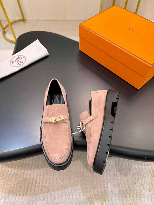 爱马仕 Hermes 2025秋冬新款 Kelly扣 Lcone拼色低跟女鞋 H家厚底圆头时尚休闲乐福鞋 材质:鞋面进口小牛皮+水染牛皮内里+原版开模组合大底