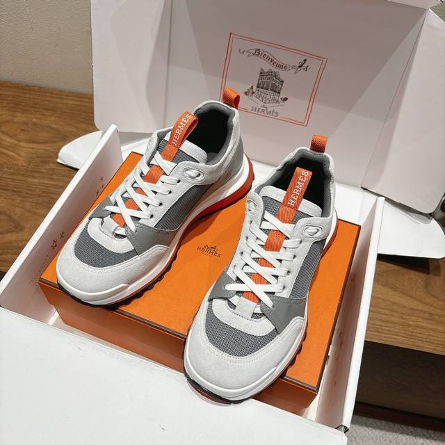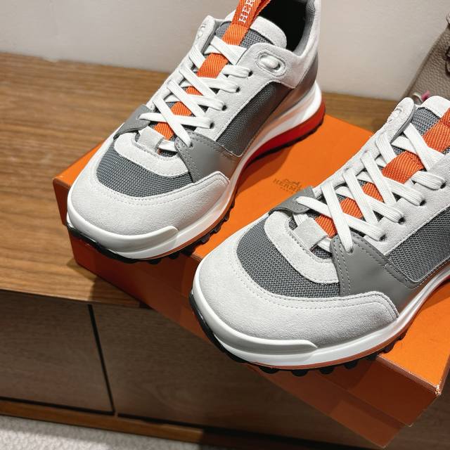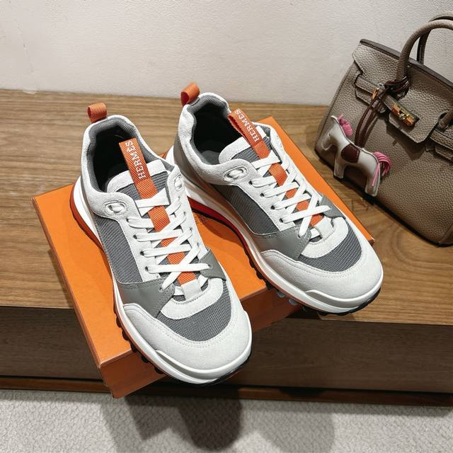 H爱马仕Bouncing运动鞋,男士休闲运动鞋,鞋面小牛皮和麂皮山羊皮拼接打造,进口材质,质感十足,轻盈鞋底装饰撞色图案,打...