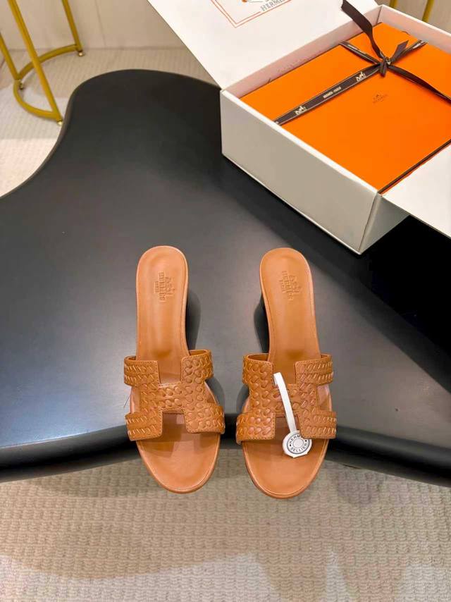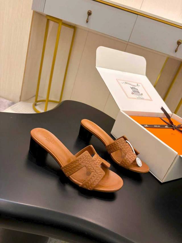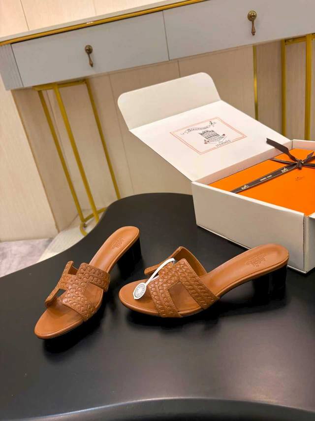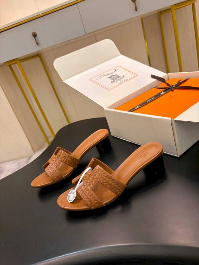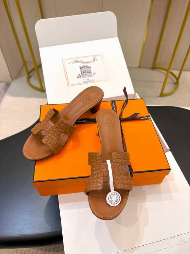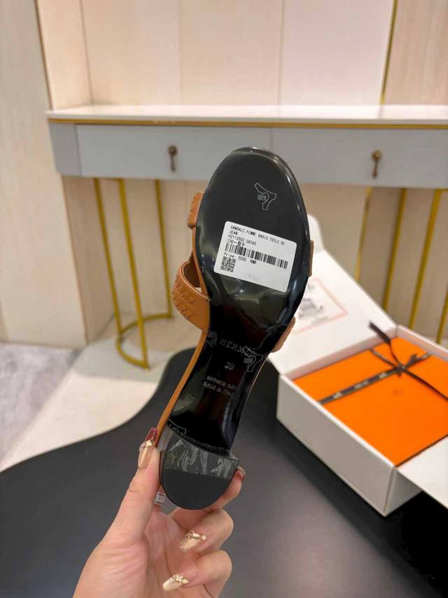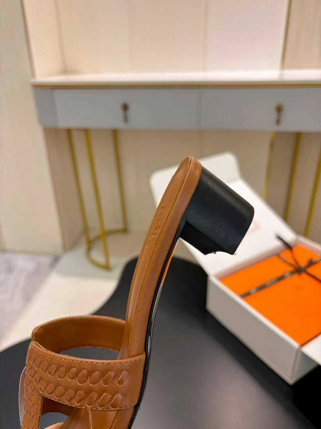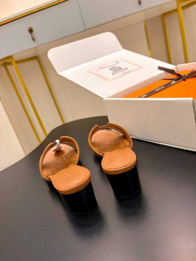 / 飞机盒另加10 * 爱玛仕 25 2025春夏新品 顶级版本经典H型Oran粗跟拖鞋系列 鞋面:原版特定牛皮 内里:进口混种羊皮 大底:原版意大利真皮大底 跟高