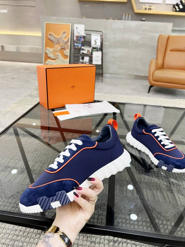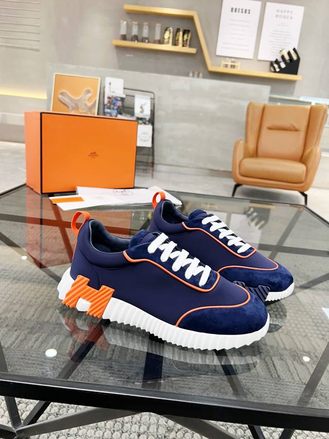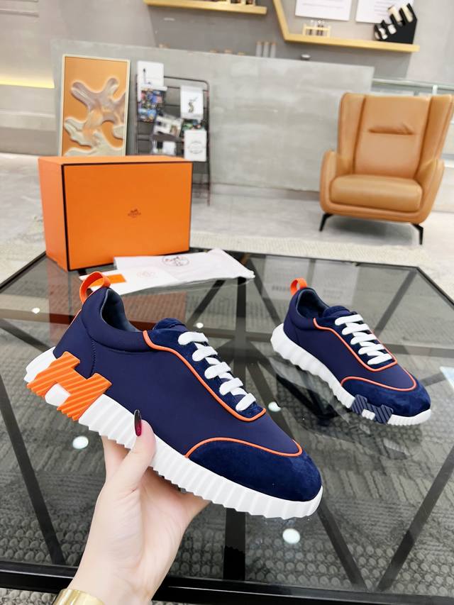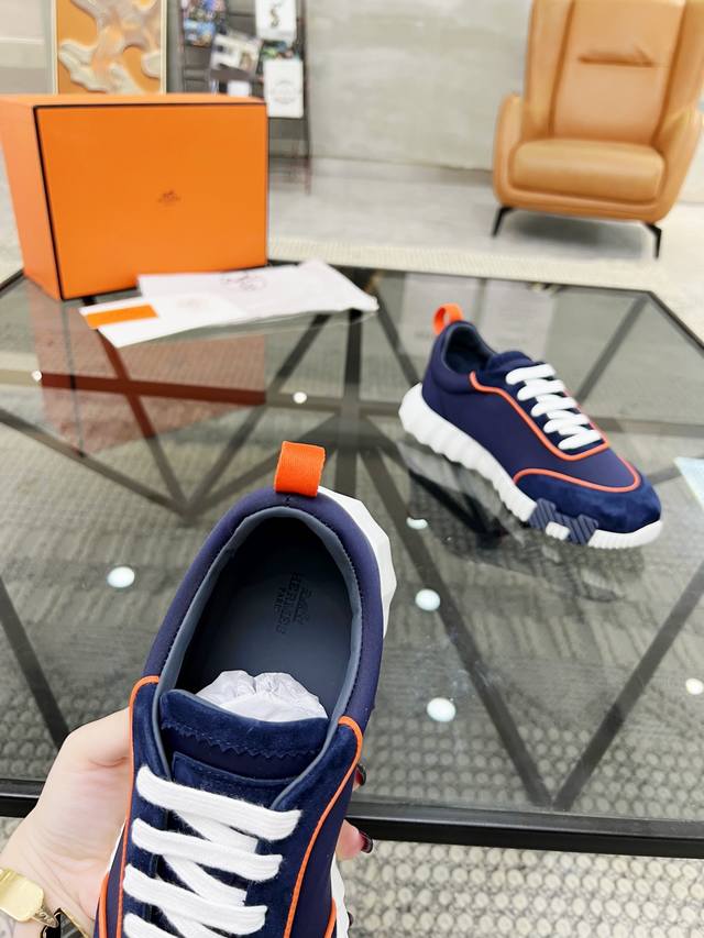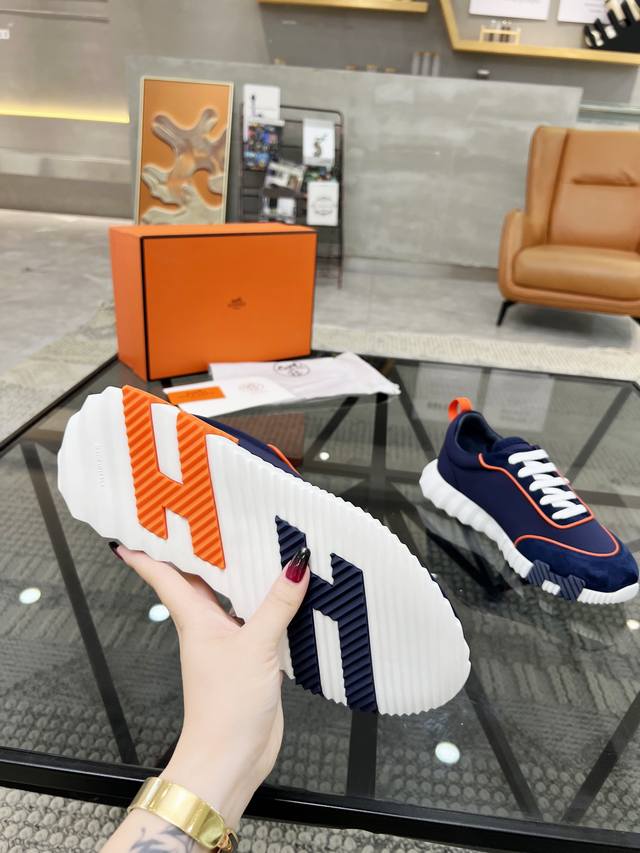 H爱马仕Bouncing运动鞋,情侣款休闲运动鞋,鞋面小牛皮和网布拼接打造,进口材质,质感十足,轻盈鞋底装饰撞色图案,打造百搭时尚风格。 DDD Size:35-44 45定做 DDD