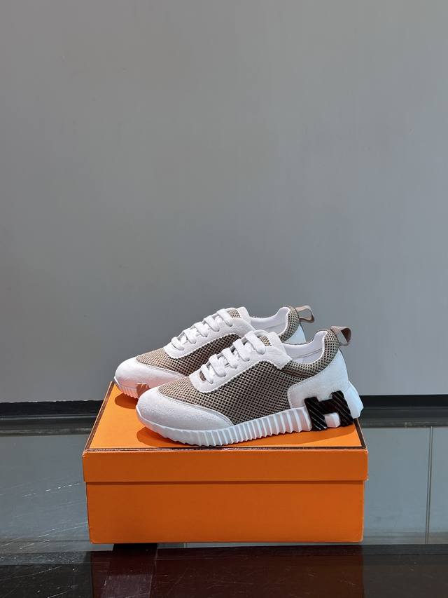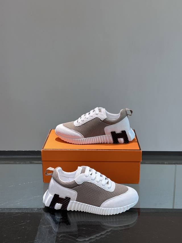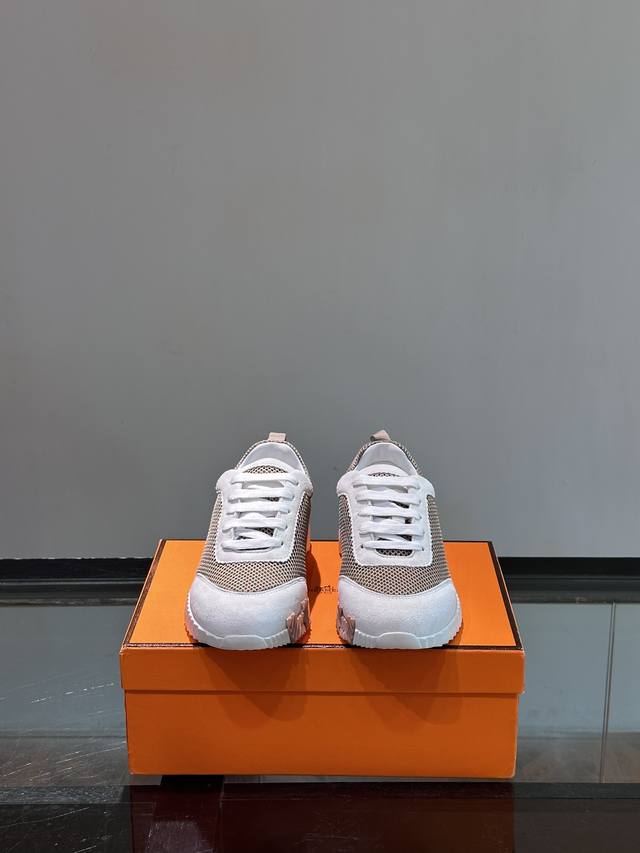 H爱马仕Bouncing运动鞋,情侣款休闲运动鞋,鞋面小牛皮和网布拼接打造,进口材质,质感十足,轻盈鞋底装饰撞色图案,打造百搭时尚风格。 DDD Size:35-44 45定做 DDD