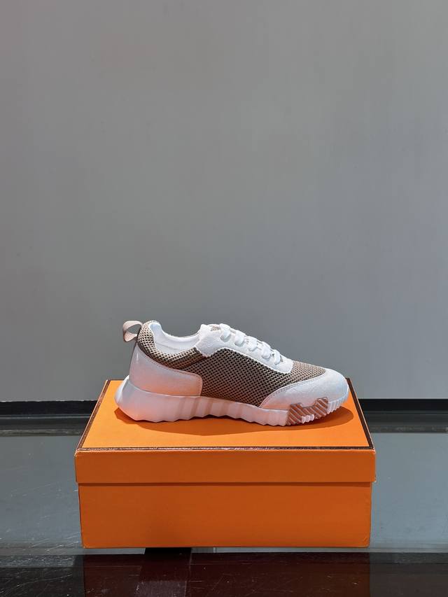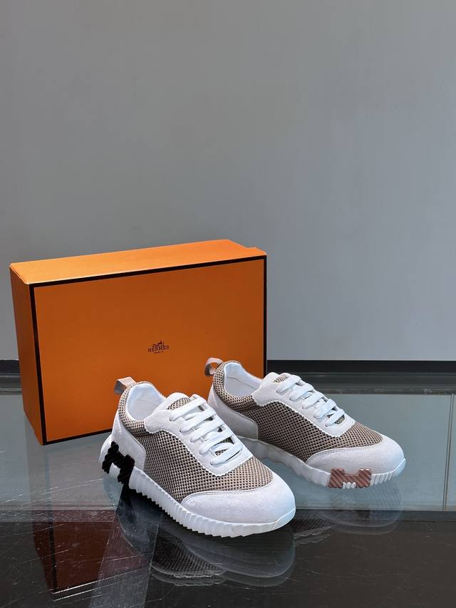 H爱马仕Bouncing运动鞋,情侣款休闲运动鞋,鞋面小牛皮和网布拼接打造,进口材质,质感十足,轻盈鞋底装饰撞色图案,打造百搭时尚风格。 Size:35-44