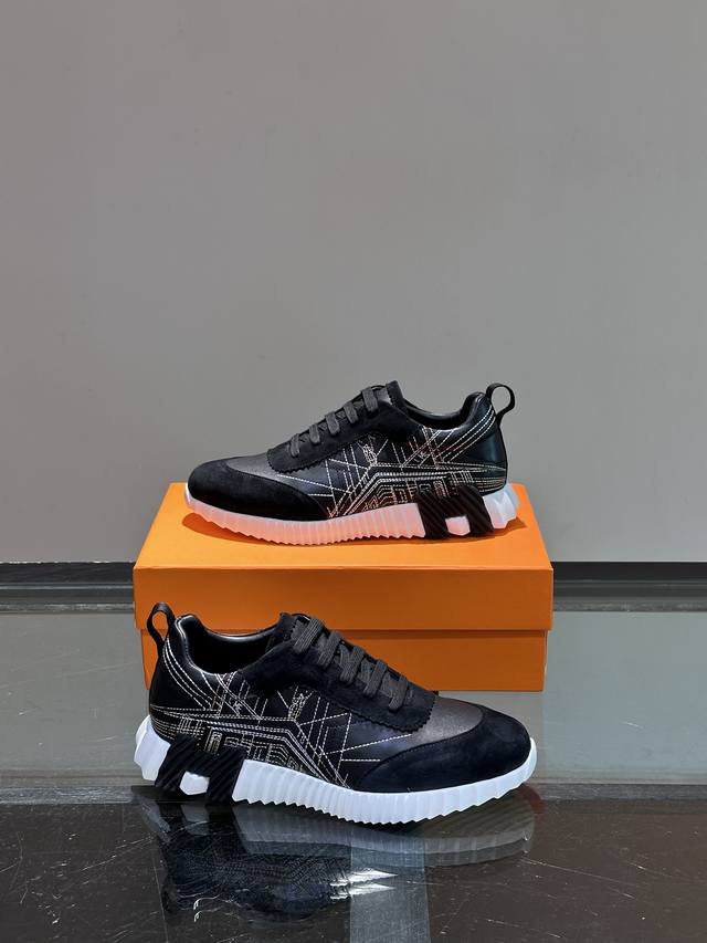 H爱马仕Bouncing运动鞋,男士休闲运动鞋,鞋面小牛皮和麂皮山羊皮拼接打造,进口材质,质感十足,轻盈鞋底装饰撞色图案,打造百搭时尚风格。 DDD Size:38-44 45.46定做 DDD