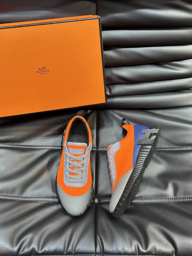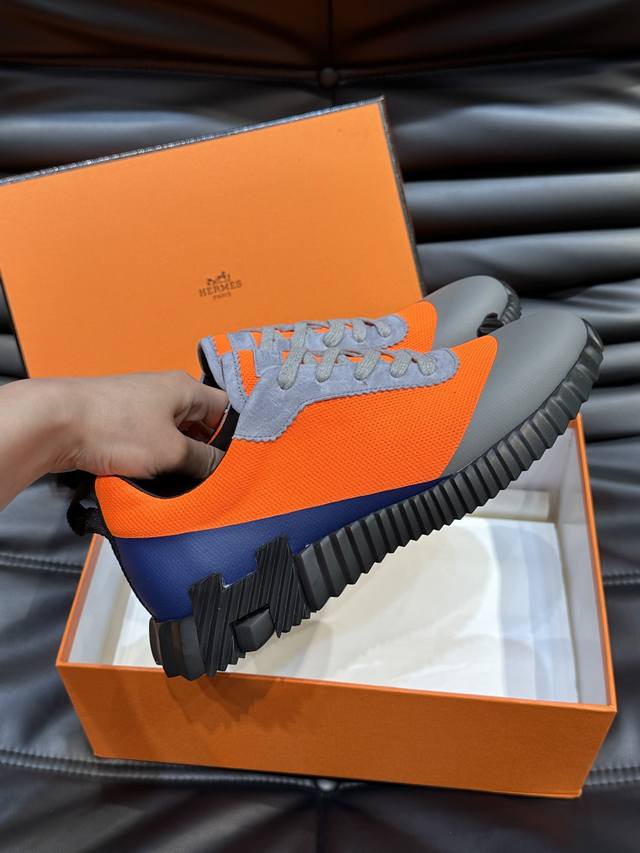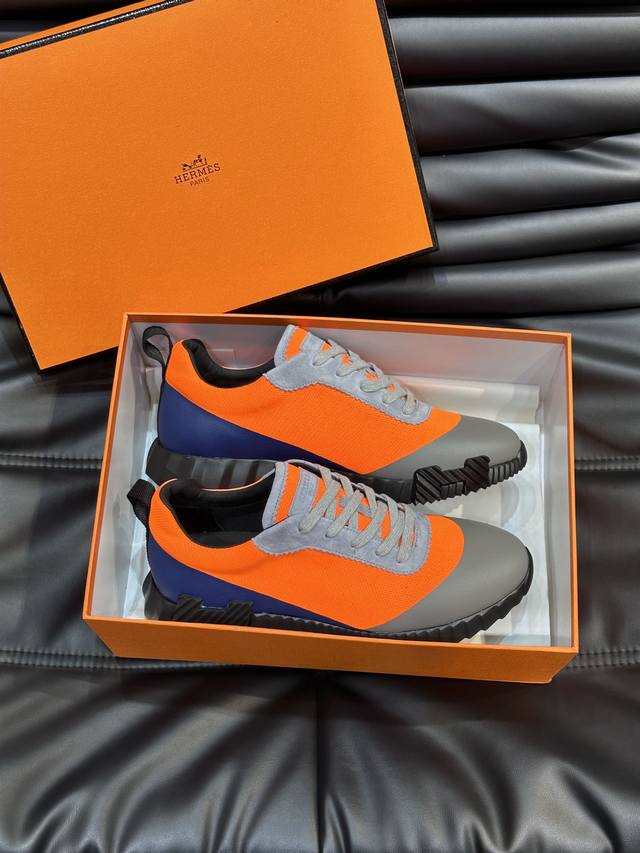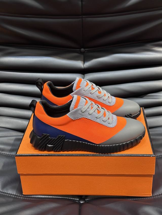 H爱马仕Bouncing运动鞋,男士休闲运动鞋,鞋面牛皮拼接高端网布打造,进口材质,质感十足,轻盈鞋底装饰撞色图案,打造百搭时尚风格。 Size:38-44