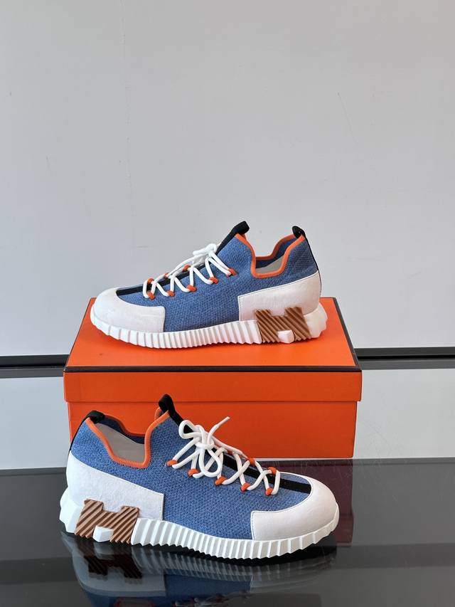 Herme* 爱马仕高端男士时尚休闲运动鞋,精工打造,定制进口飞织制作,叠层设计鞋面线条感层次分明,羊皮内里脚垫,轻质橡胶大底。轻奢风格,复古的舒适圆头,鞋面透
