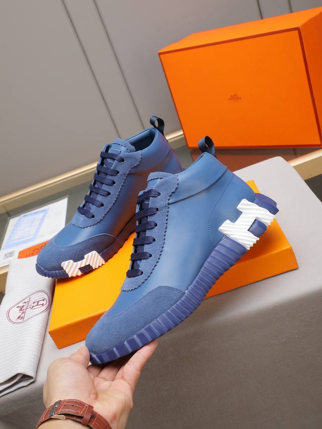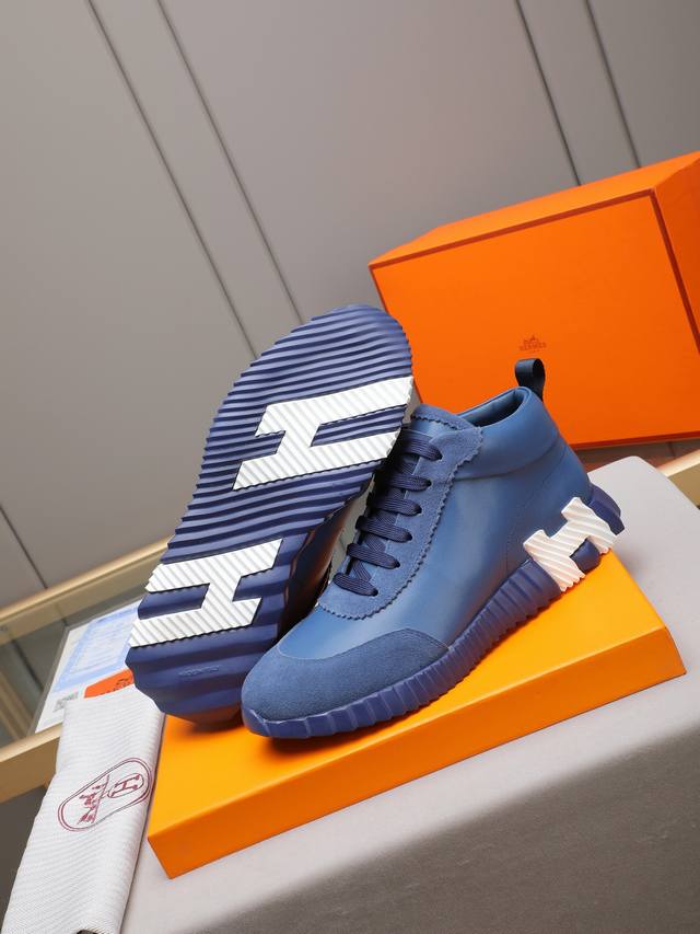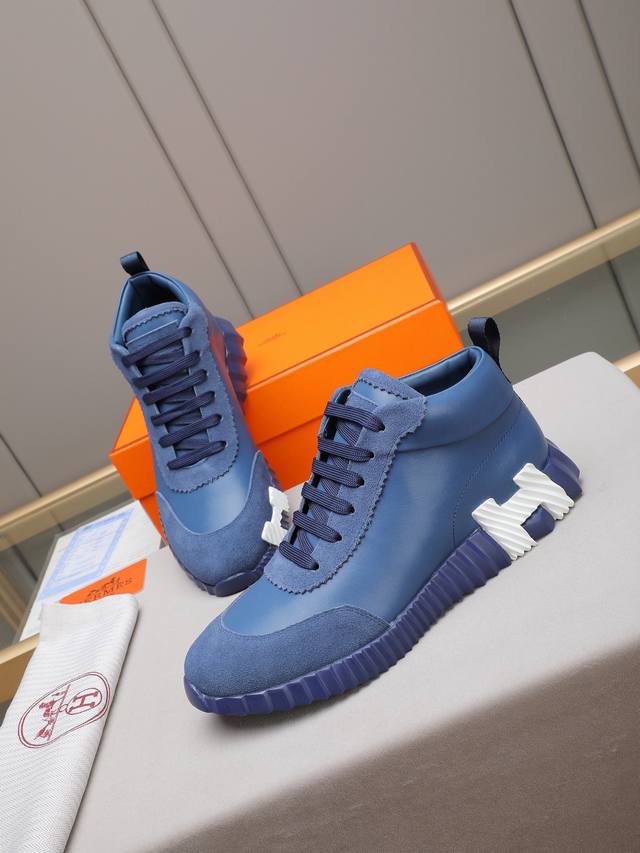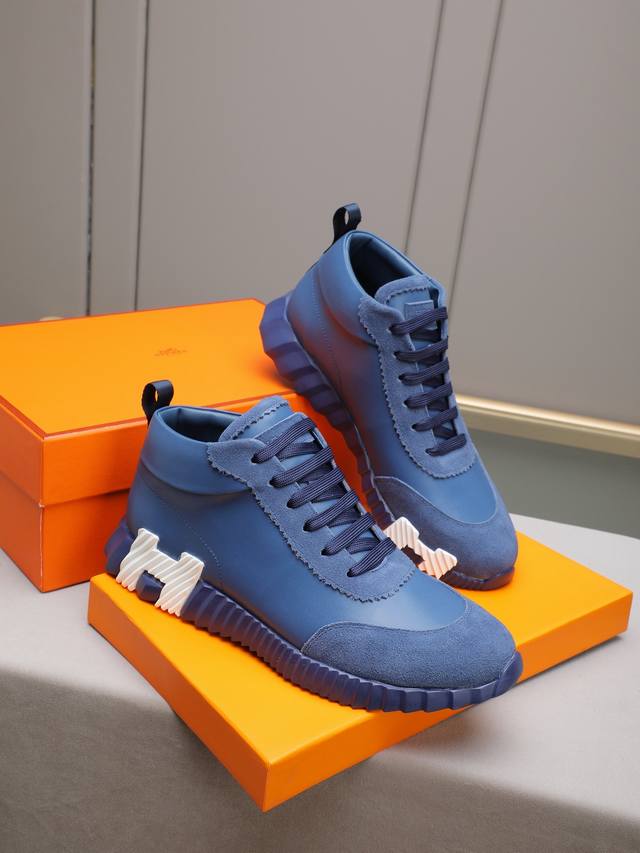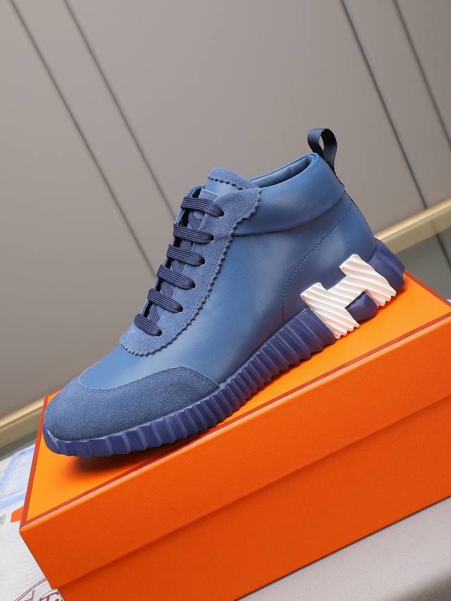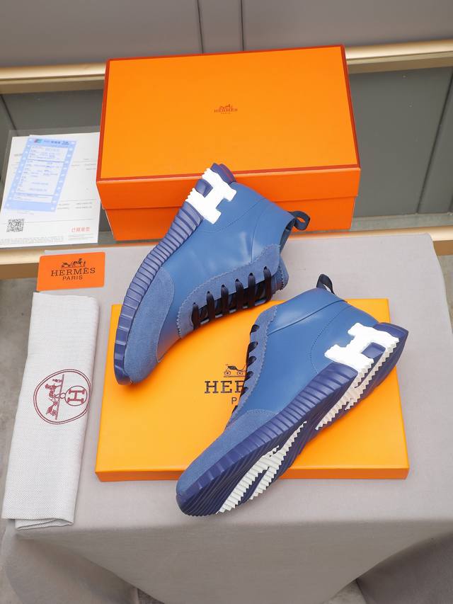 Hermes 爱马仕高帮男鞋 男士运动鞋,饰有富有质感的小牛皮细节。拼接原版牛皮面,此鞋款从马术世界汲取灵感,融合技术细节和实用功能.透气羊里,原版组合大底,高端品质,各处细节均完美结合! Ddd Size:38-44 45可定做 DDD