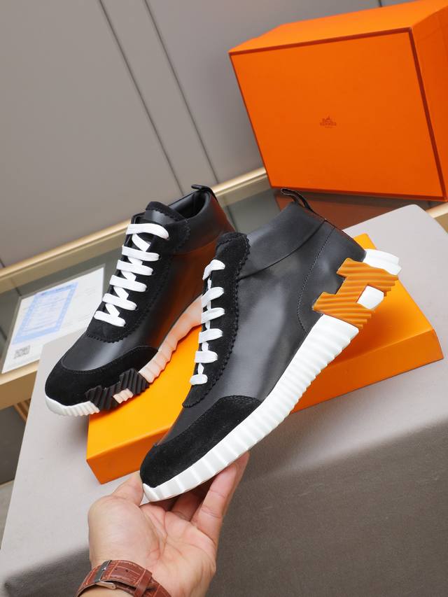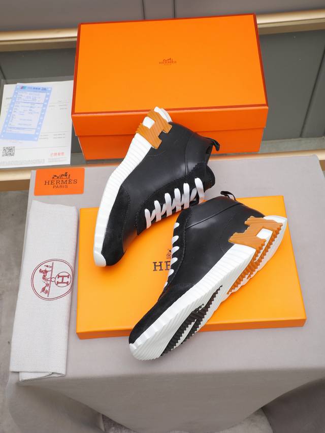 Hermes 爱马仕高帮男鞋 男士运动鞋,饰有富有质感的小牛皮细节。拼接原版牛皮面,此鞋款从马术世界汲取灵感,融合技术细节和实用功能.透气羊里,原版组合大底,高端品质,各处细节均完美结合! Ddd Size:38-44 45可定做 DDD