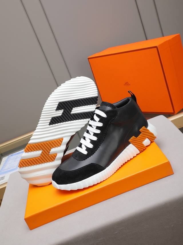 / Hermes 爱马仕高帮男鞋 男士运动鞋,饰有富有质感的小牛皮细节。拼接原版牛皮面,此鞋款从马术世界汲取灵感,融合技术细节和实用功能.透气羊里,原版组合大底,高