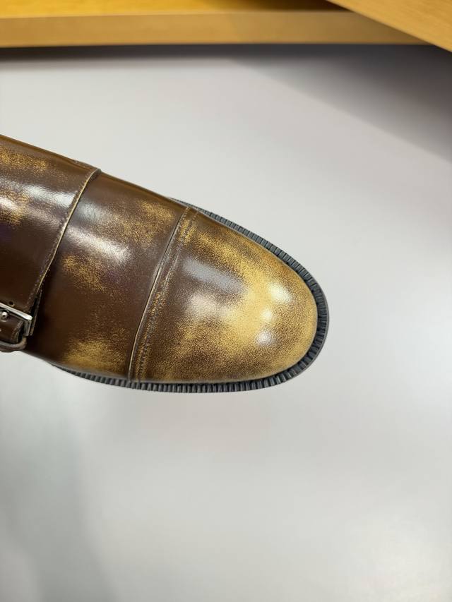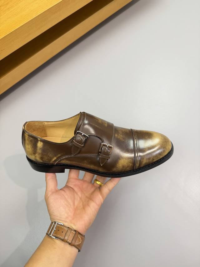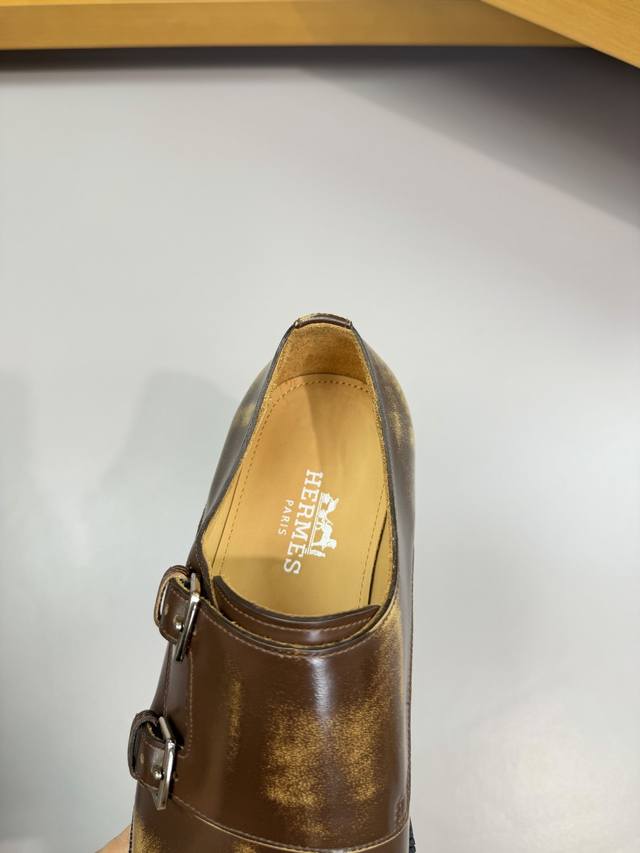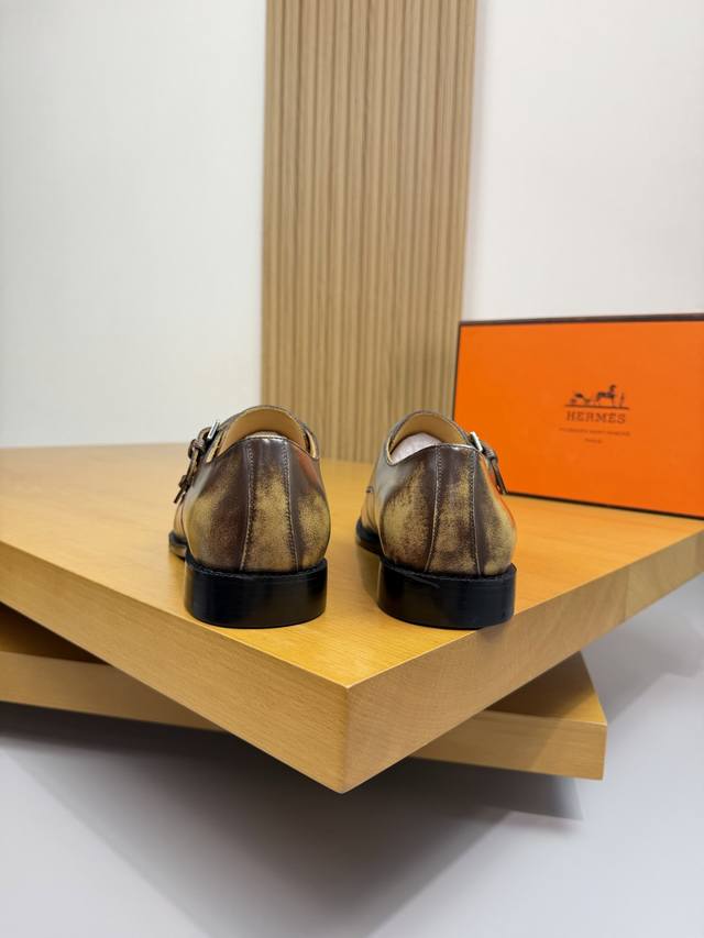 Hermes 爱马仕 -高端品质 原单 正装皮鞋 -鞋面:开边珠擦色小牛皮、品牌金属扣件装饰 -内里:水染牛皮 -大底:超轻Tpr 橡胶;组合成型大底 -超高品