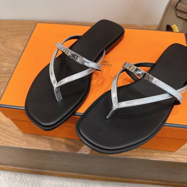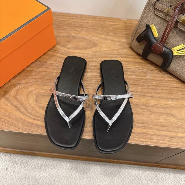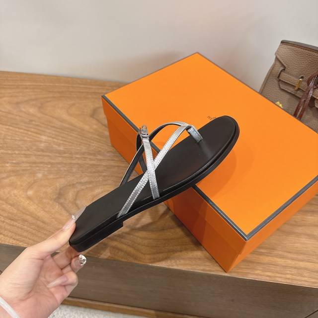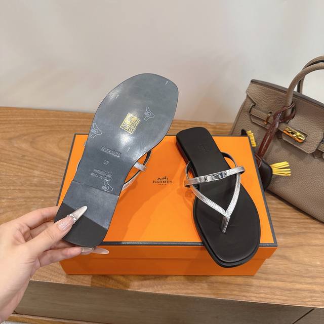 Hermes 爱马仕 -高端品质 原单 休闲凉拖鞋 -鞋面:高丝光反绒小牛皮、鞋丹外合车缝线、品牌横担装饰 -内里:水染牛皮...
