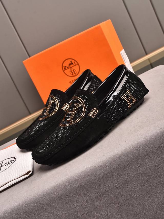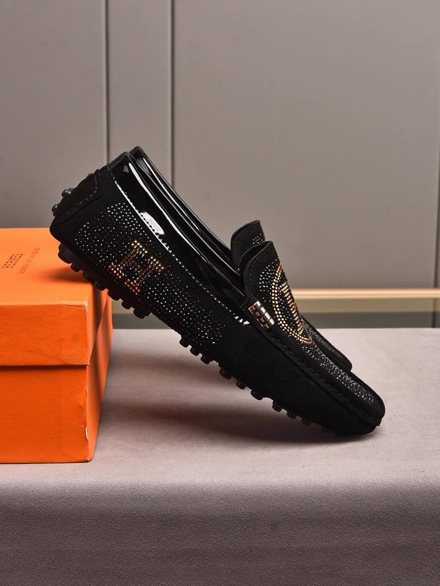 FFF Pp 潮牌款烫钻来袭 爱马仕豆豆男鞋 豆豆鞋男士超A超潮款时尚休闲驾车便鞋豆豆鞋 进口高丝光反毛皮面料 超滑质感 吸汗透气 猪皮内里 。鞋身烫钻Logo工艺标志 法国乐福套脚设计风格 低调大方 上脚效果超赞..男鞋码数:现货38-44码。45,46可订做。颜色:黑色选择。 DDD
