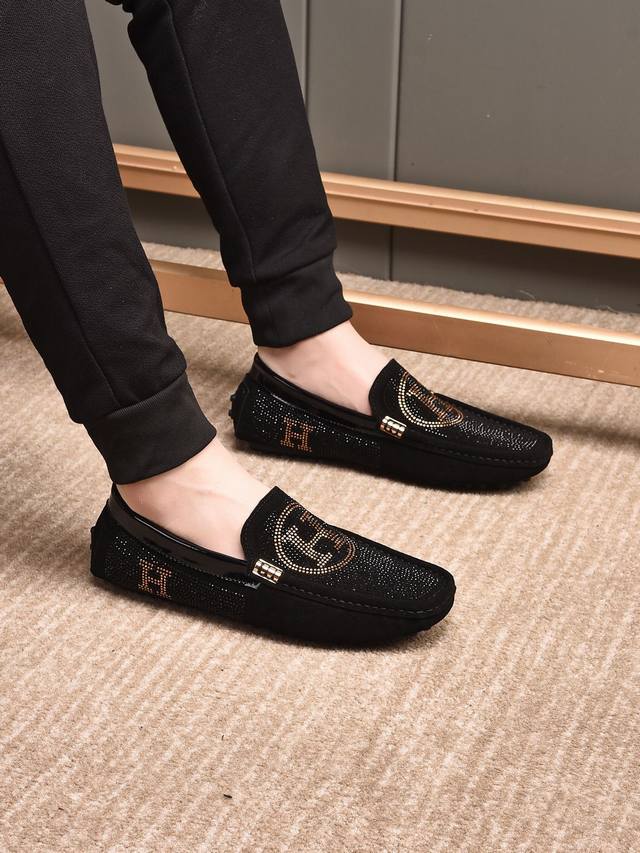 / Pp 潮牌款烫钻来袭 爱马仕豆豆男鞋 豆豆鞋男士超A超潮款时尚休闲驾车便鞋豆豆鞋 进口高丝光反毛皮面料 超滑质感 吸汗透气 猪皮内里 。鞋身烫钻Logo工艺标志