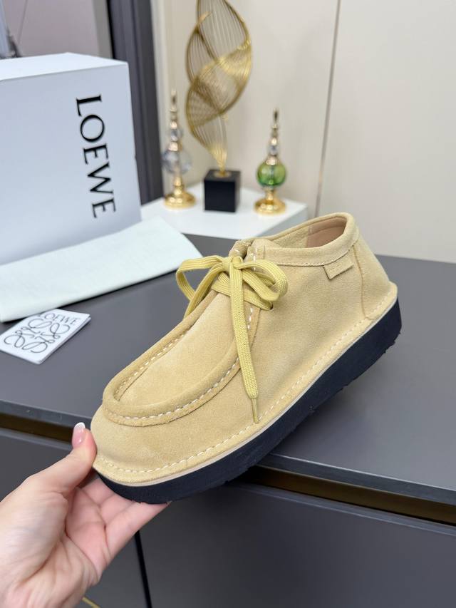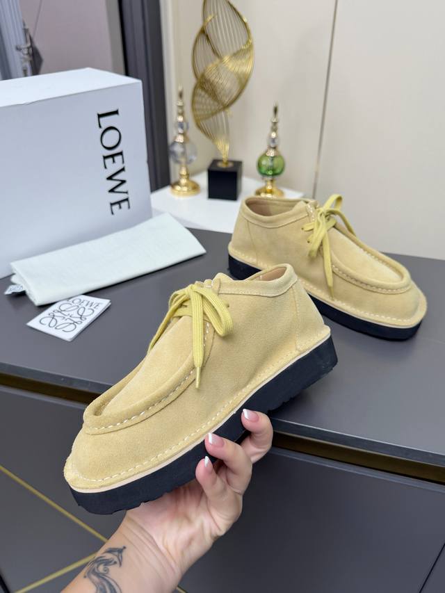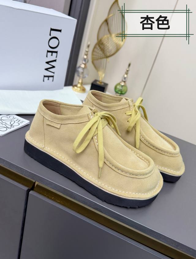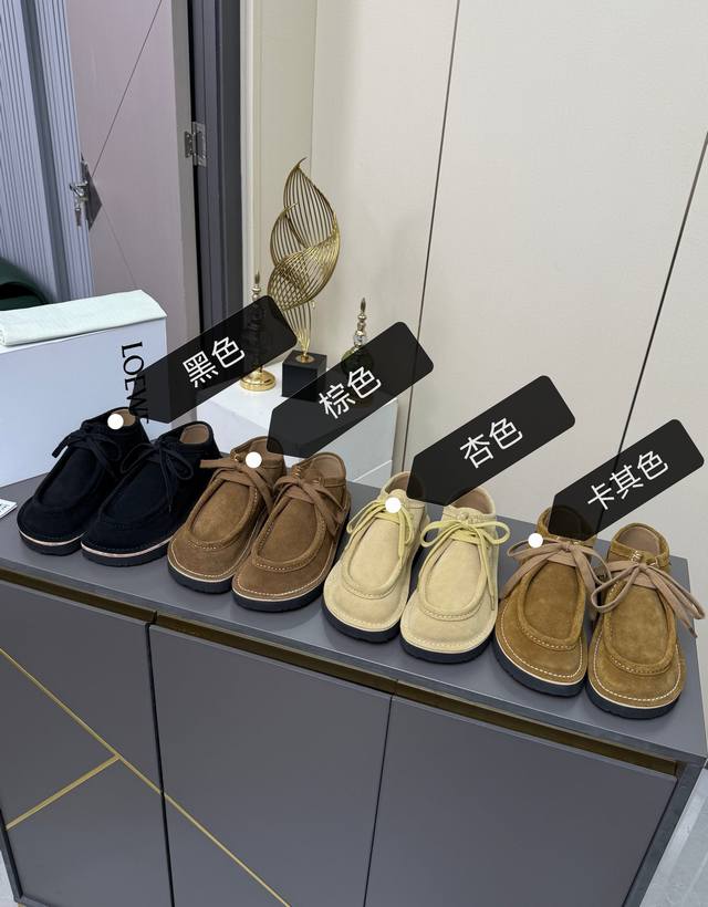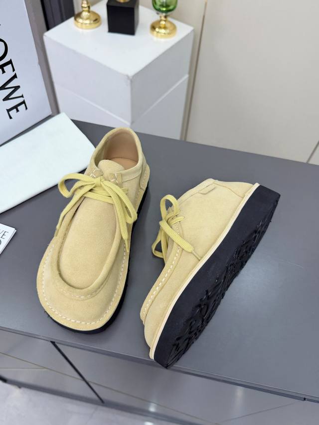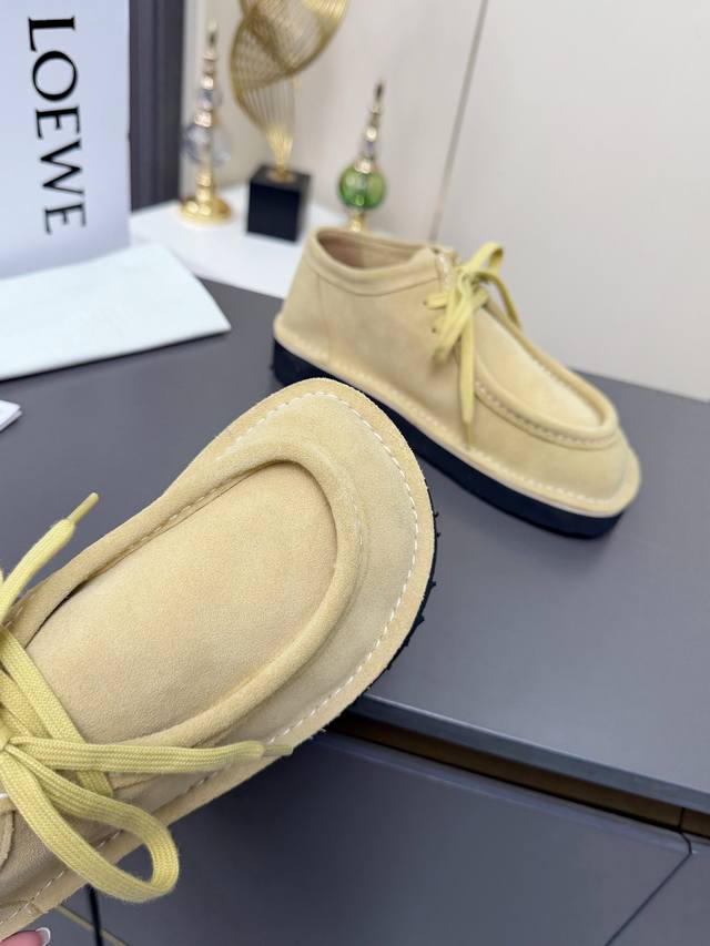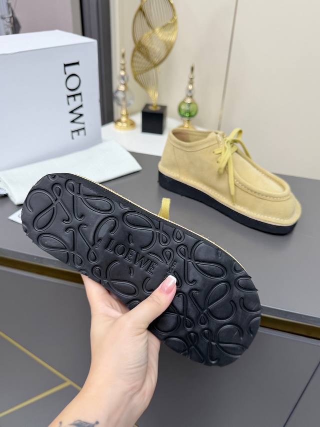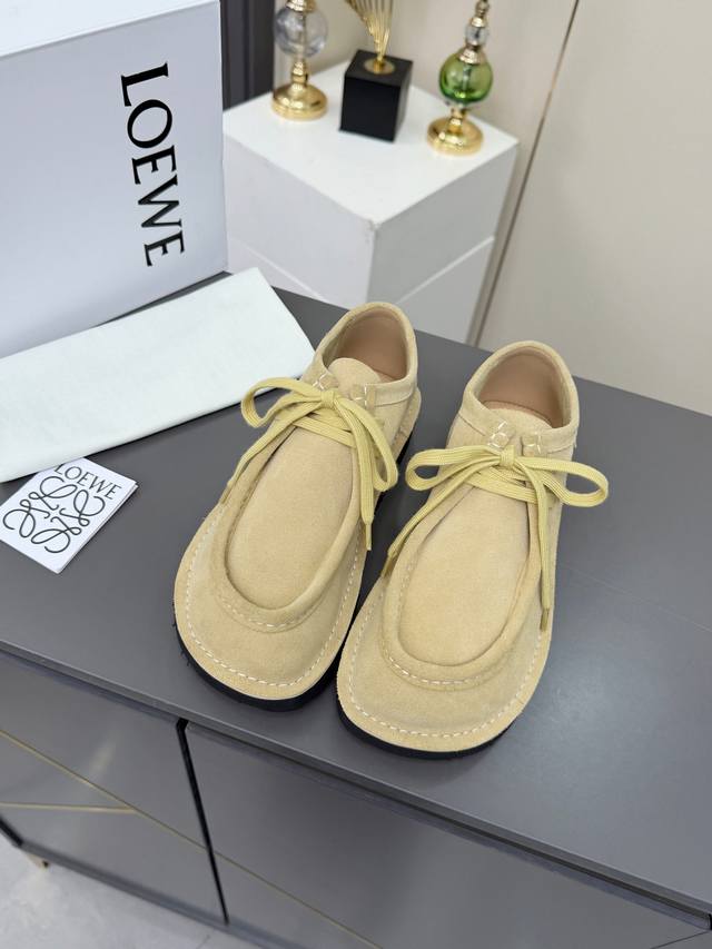工厂p价 女装女鞋 运动原单 Loewe 罗意威最新款袋鼠鞋,牛剖层革绒面牛皮革 厚底系带 休闲单鞋绑带复古英伦风,从设计到质感,让你轻松拥有高奢级穿搭体验。鞋面采用进口高丝光牛反绒,细腻的肌理带着自然的绒感光泽,每一寸都透着低调的精致,与脚感轻盈的Eva发泡大底搭配,3公分跟高恰到好处,既悄悄拉长身形,又能带来如履平地的舒适! DDD 原版购入开发,细节处理到位,值得拥有。独具时尚潮流领先风格,强烈推荐备货入手 DDD 鞋型韵味超赞,皮质柔软舒适度极高,上脚非常舒服而且又好搭配 DDD 面料:进口高丝光