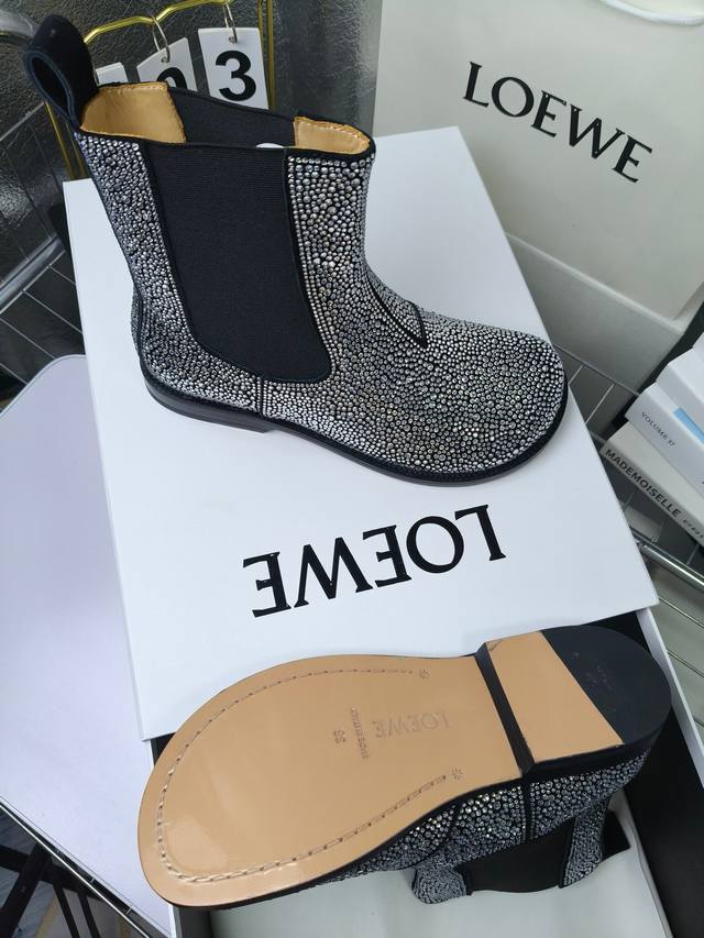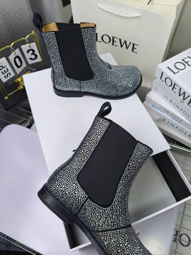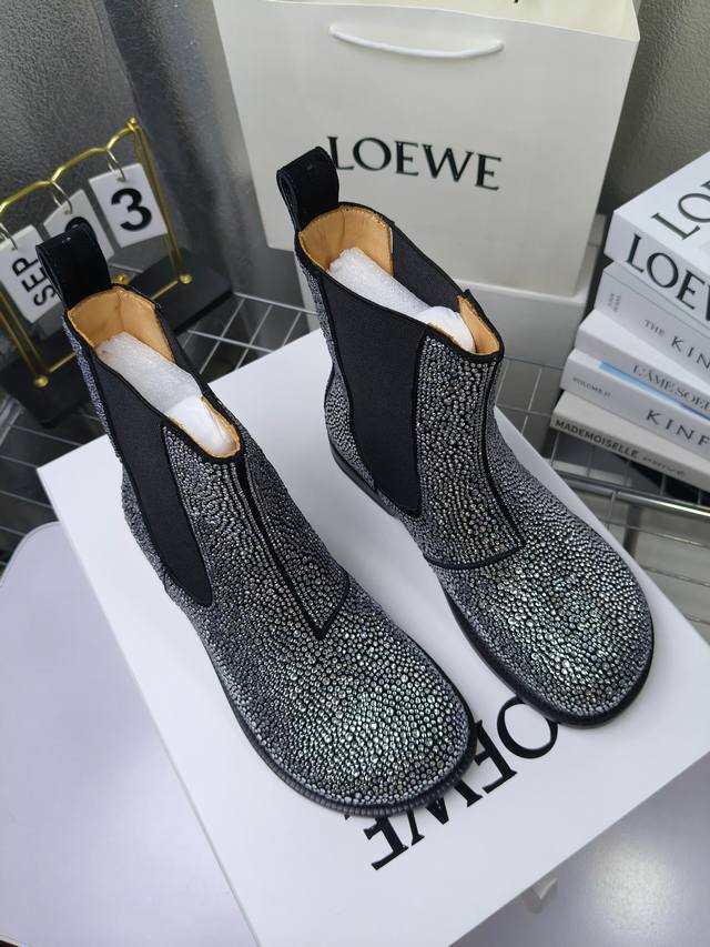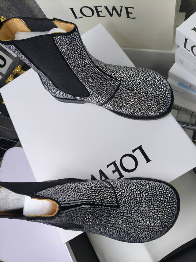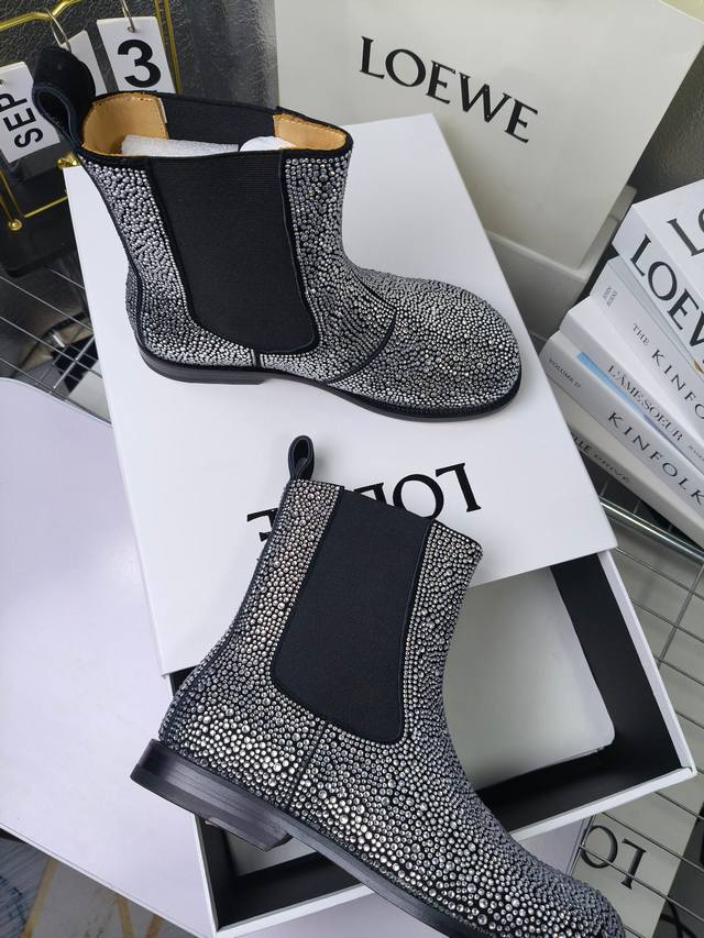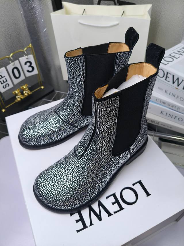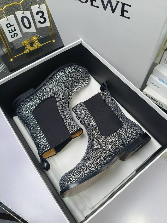 罗意威 Loewe 秋冬新款短靴 火爆新款 配合整体原版楦型,时尚而个性好穿 颜色超赞 面料:进口羊京烫进口钻 内里:水染牛皮 垫脚:水染牛皮 大底:原版真皮大底 包装:原版全套包装 码数:35-40 40.41订做