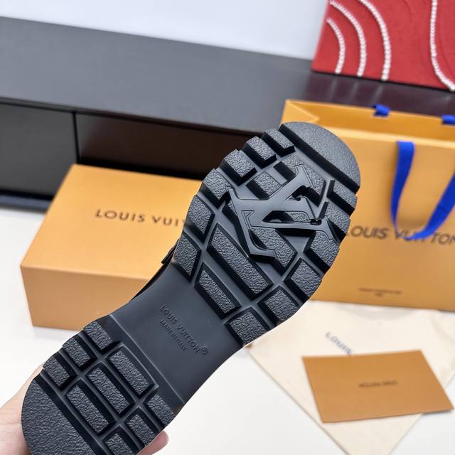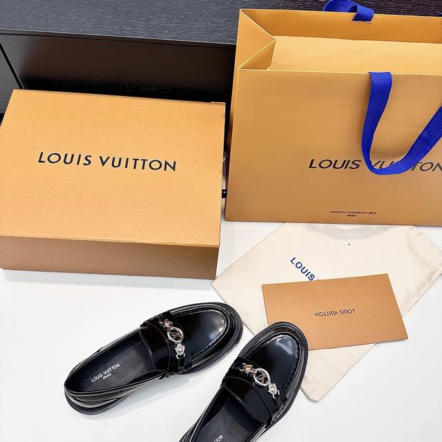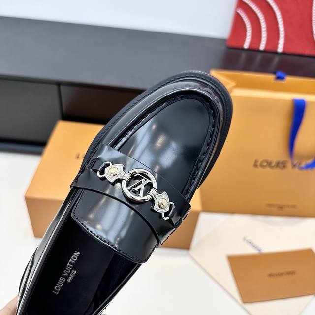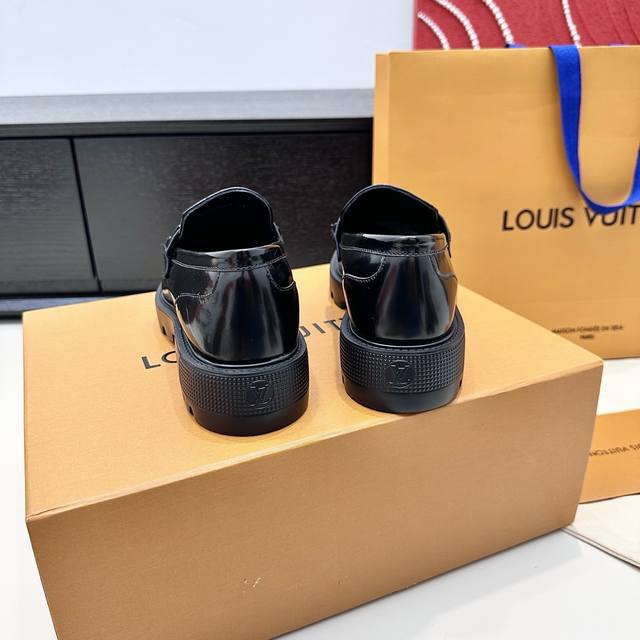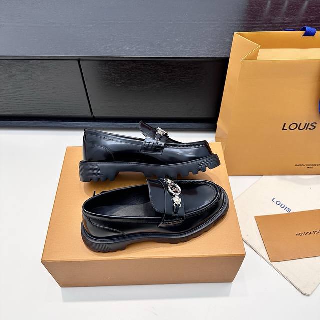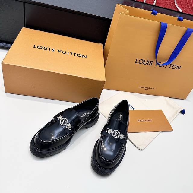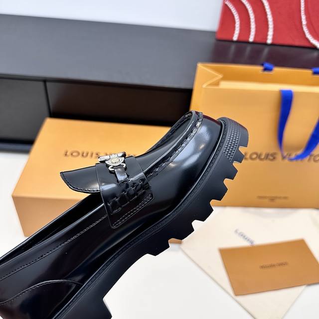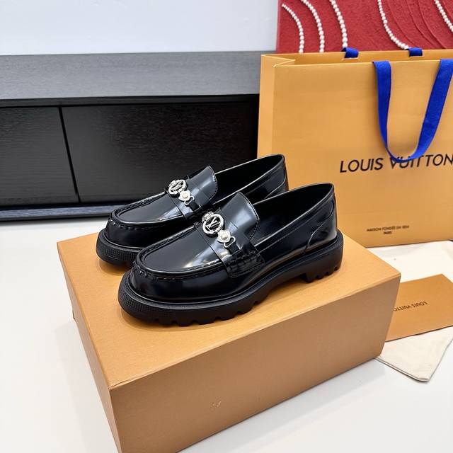 代购版 Lv驴牌 25年冬季新款 厚底乐福鞋,以亮面皮革塑造复古格调,金属Lv标识与饰扣细节尽显奢华质感。厚底设计增添摩登气场,无论是搭配西装还是裙装,都能轻松
