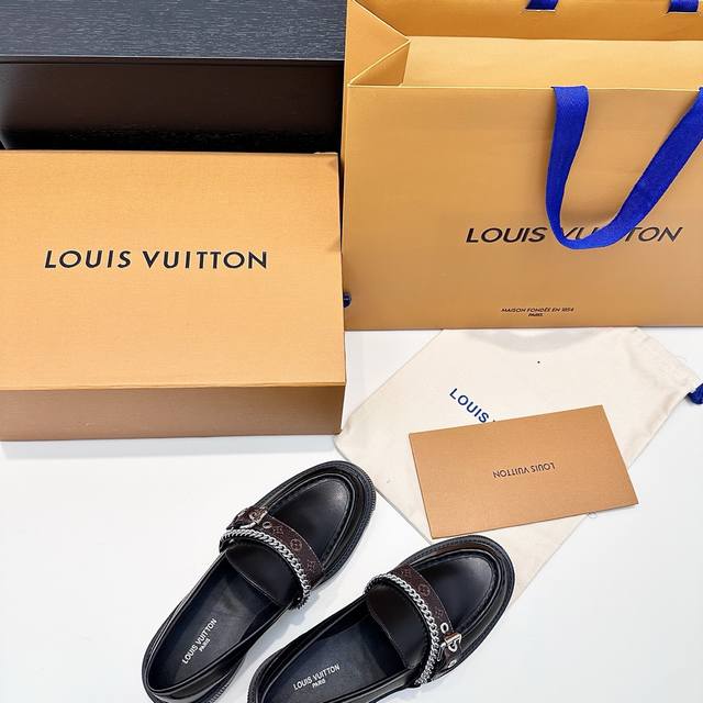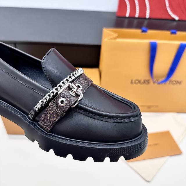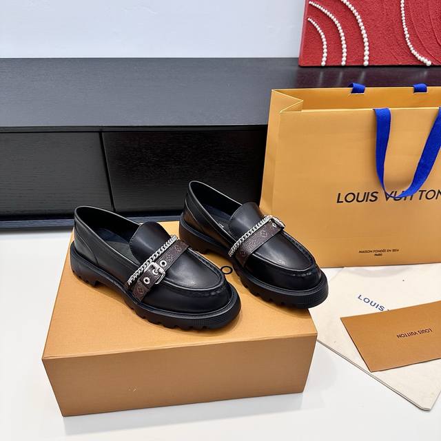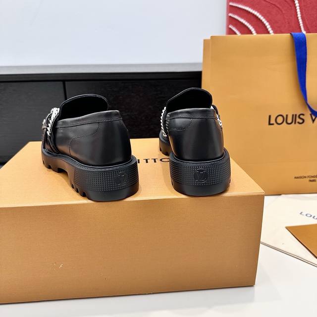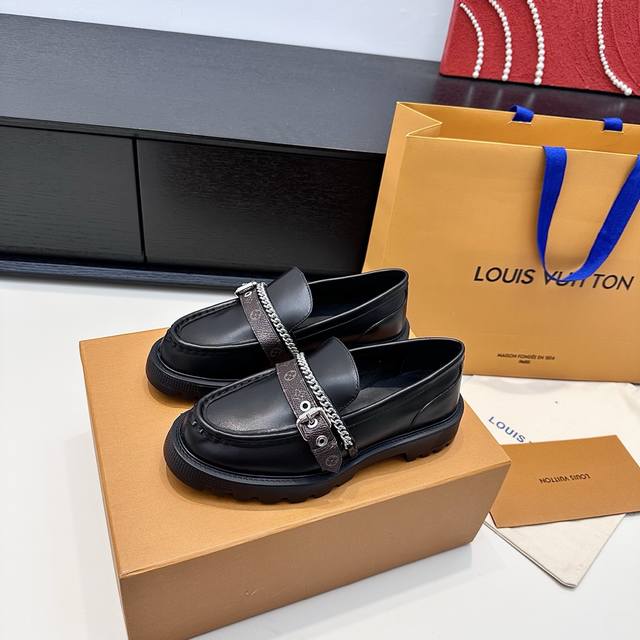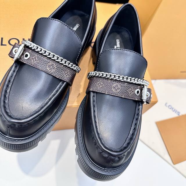 / 代购版 Lv驴牌 25年厚底乐福鞋,将经典与潮酷完美融合。黑色皮革质感高级,老花饰带搭配金属链条,细节处尽显奢华。厚底设计增添随性气场,无论是职场通勤还是日常出